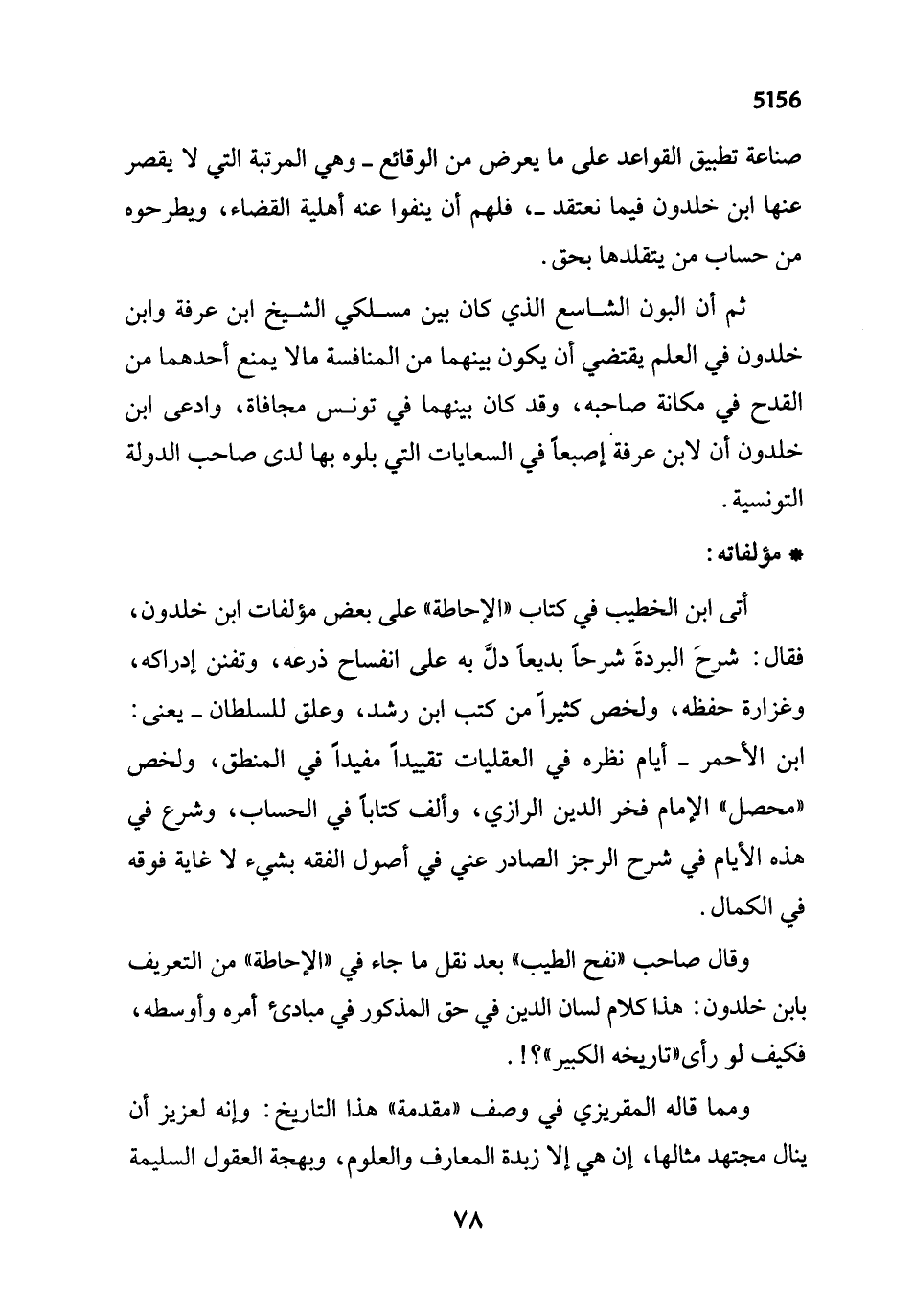 وقال صاحب "نفح الطيب" بعد نقل ما جاء في "الإحاطة" من التعريف بابن خلدون: هذا كلام لسان الدين في حق المذكور في مبادئ أمره وأوسطه، فكيف لو رأى "تاريخه الكبير"؟!.