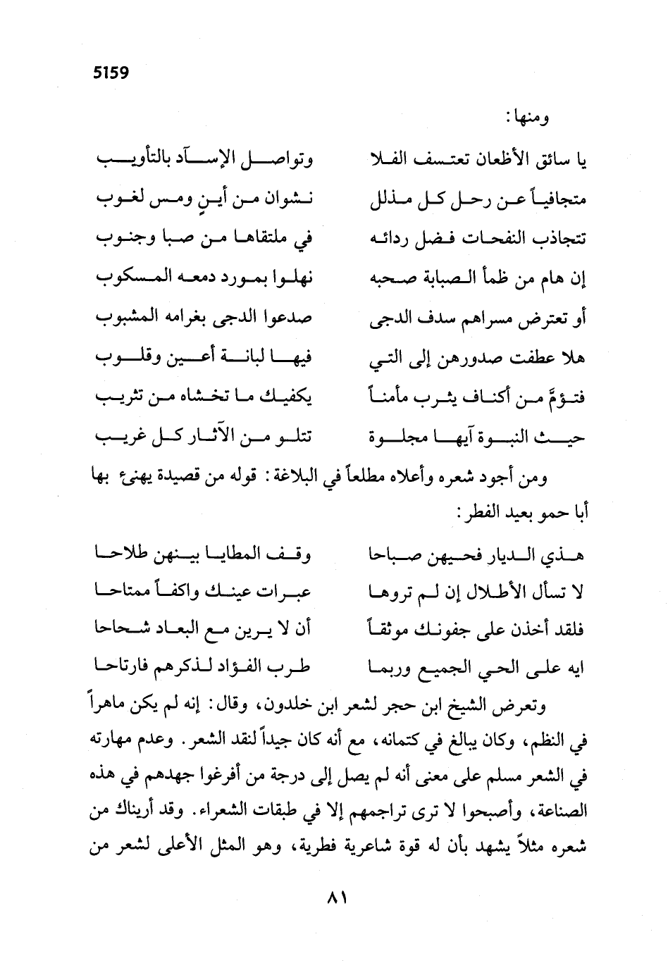 وتعرض الشيخ ابن حجر لشعر ابن خلدون، وقال: إنه لم يكن ماهراً في النظم، وكان يبالى في كتمانه، مع أنه كان جيداً لنقد الشعر. وعدم مهارته في الشعر مسلم على معنى أنه لم يصل إلى درجة من أفرغوا جهدهم في هذه الصناعة، وأصبحوا لا ترى تراجمهم إلا في طبقات الشعراء. وقد أريناك من شعره مثلاً يشهد بأن له قوة شاعرية فطرية، وهو المثل الأعلى لشعر من