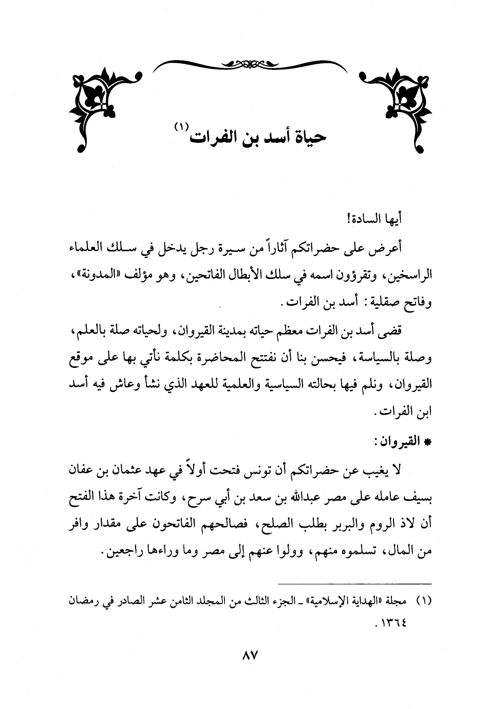 أعرض على حضراتكم آثاراً من سيرة رجل يدخل في سلك العلماء الراسخين، وتقرؤون اسمه في سلك الأبطال الفاتحين، وهو مؤلف "المدونة"، وفاتح صقلية: أسد بن الفرات.