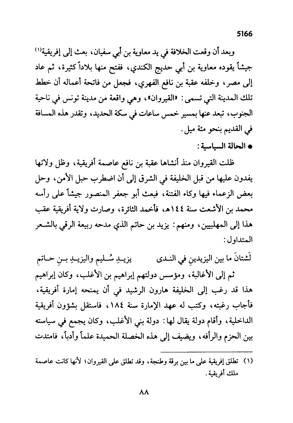 وبعد أن وقعت الخلافة في يد معاوية بن أبي سفيان، بعث إلى إفريقية (¬1) جيشاً يقوده معاوية بن أبي حديج الكندي، ففتح منها بلاداً كثيرة، ثم عاد إلى مصر، وخلفه عقبة بن نافع الفهري، فجعل من فاتحة أعماله أن خطط تلك المدينة التي تسمى: "القيروان"، وهي واقعة من مدينة تونس في ناحية الجنوب، تبعد عنها بمسير خمس ساعات في سكة الحديد، وتقدر هذه المسافة في القديم بنحو مئة ميل.