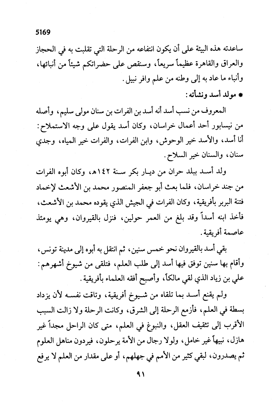 ولم يقنع أسد بما تلقاه من شيوخ أفريقية، وتاقت نفسه لأن يزداد بسطة في العلم، فأزمع الرحلة إلى الشرق، وكانت الرحلة ولا زالت السبب الأقرب إلى تثقيف العقل، والنبوغ في العلم، متى كان الراحل مجداً غير هازل، نبيهاً غير خامل، ولولا رجال من الأمة يرحلون، فيردون مناهل العلوم ثم يصدرون، لبقي كثير من الأمم في جهلهم، أو على مقدار من العلم لا يرفع