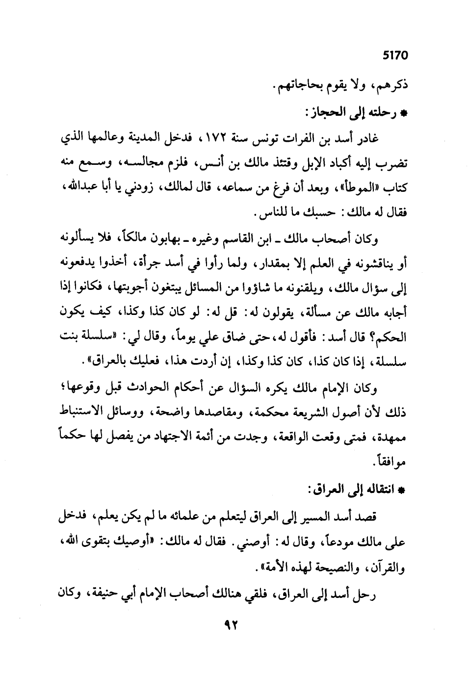 غادر أسد بن الفرات تونس سنة 172، فدخل المدينة وعالمها الذي تضرب إليه أكباد الإبل وقتئذ مالك بن أنس، فلزم مجالسه، وسمع منه كتاب "الموطأ"، وبعد أن فرغ من سماعه، قال لمالك، زودني يا أبا عبد الله، فقال له مالك: حسبك ما للناس.
