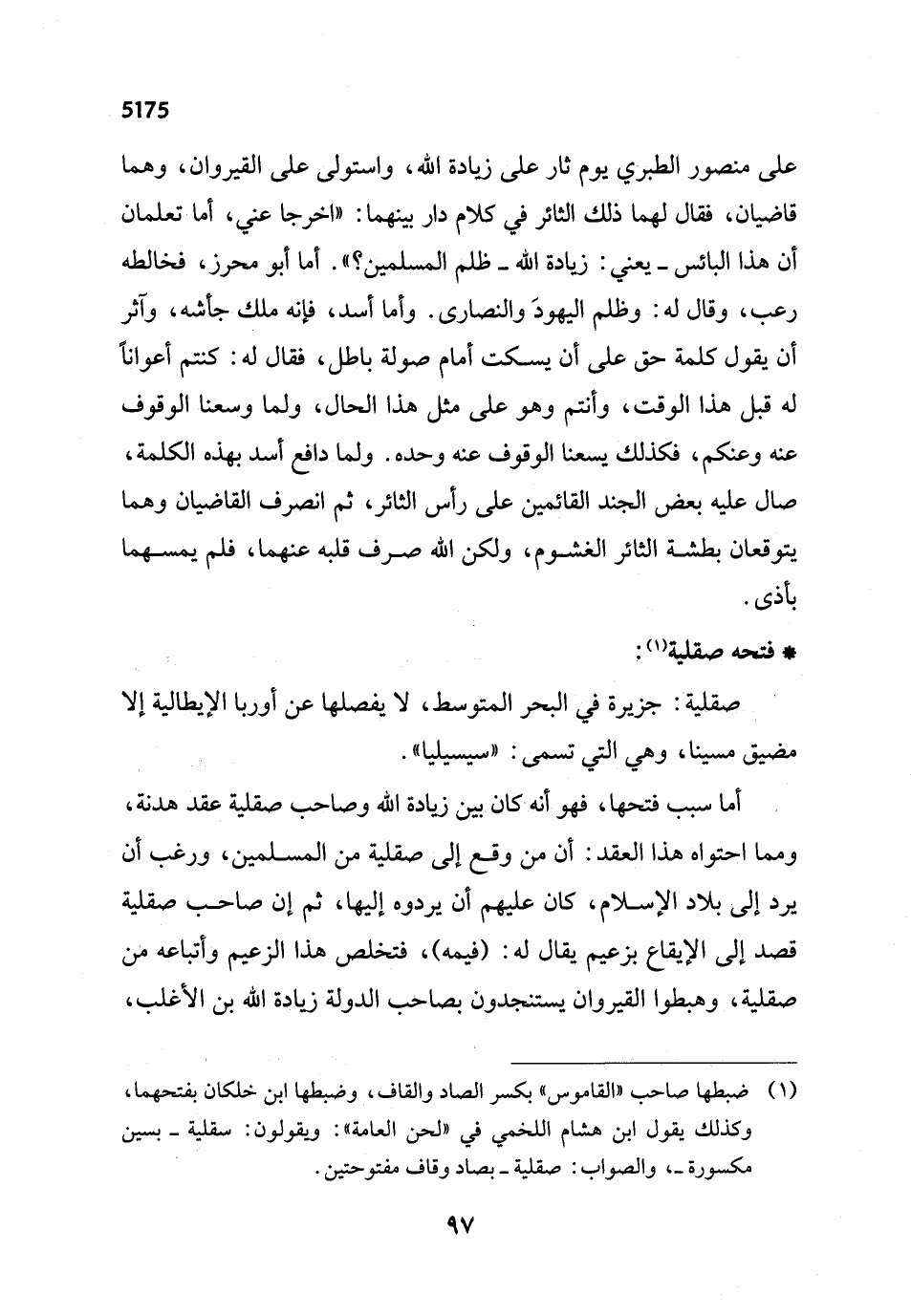 (¬1) ضبطها صاحب "القاموس" بكسر الصاد والقاف، وضبطها ابن خلكان بفتحهما، وكذلك يقول ابن هشام اللخمي في "لحن العامة": ويقولون: سقلية -بسين مكسورة- والصواب: صقلية- بصاد وقاف مفتوحتين.
