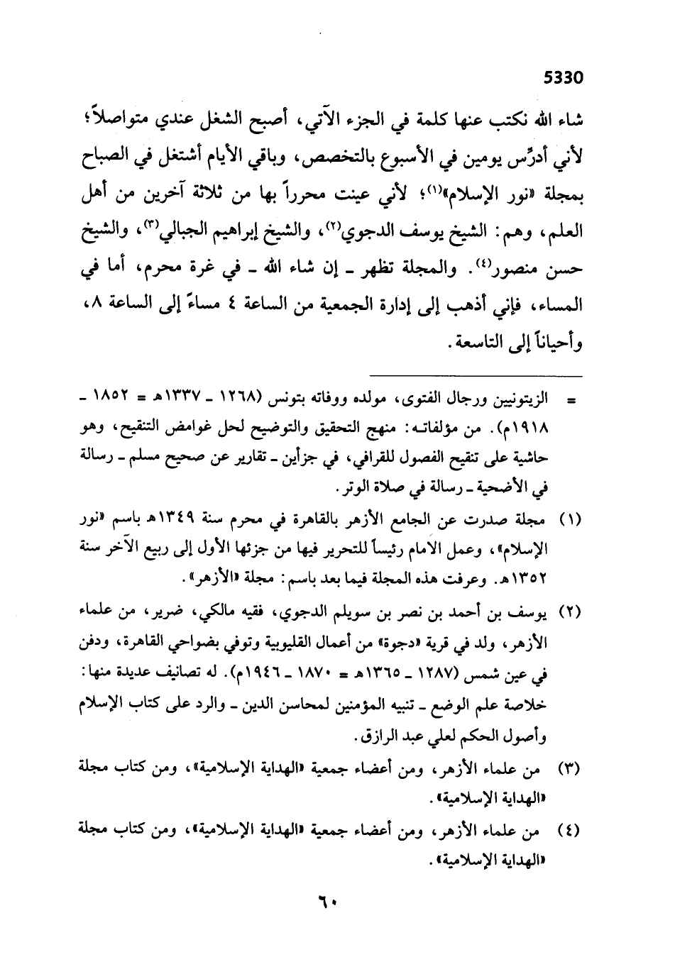 شاء الله نكتب عنها كلمة في الجزء الآتي، أصبح الشغل عندي متواصلاً؛ لأني أدرِّس يومين في الأسبوع بالتخصص، وباقي الأيام أشتغل في الصباح بمجلة "نور الإسلام" (¬1)؛ لأني عينت محرراً بها من ثلاثة آخرين من أهل العلم، وهم: الشيخ يوسف الدجوي (¬2)، والشيخ إبراهيم الجبالي (¬3)، والشيخ حسن منصور (¬4). والمجلة تظهر -إن شاء الله- في غرة محرم، أنها في المساء، فإني أذهب إلى إدارة الجمعية من الساعة 4 مساءً إلى الساعة 8، وأحياناً إلى التاسعة.