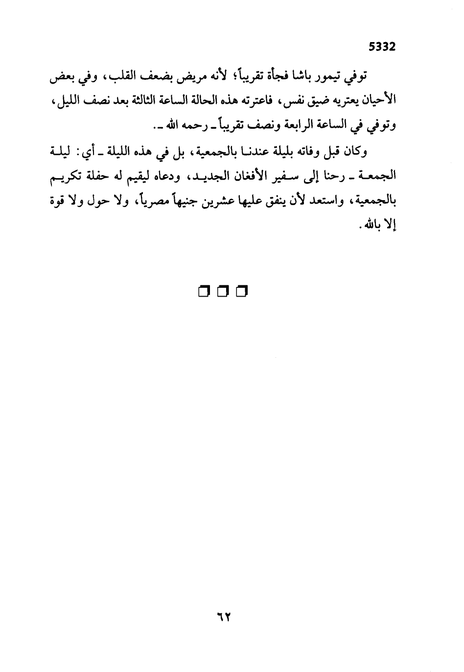 وكان قبل وفاته بليلة عندنا بالجمعية، بل في هذه الليلة -أي: ليلة الجمعة- رحنا إلى سفير الأفغان الجديد، ودعاه ليقيم له حفلة تكريم بالجمعية، واستعد لأن ينفق عليها عشرين جنيهاً مصرياً، ولا حول ولا قوة إِلا بالله.