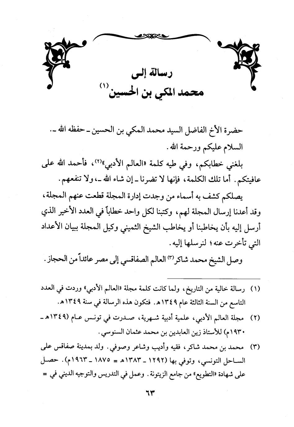(¬1) رسالة خالية من التاريخ، ولما كانت كلمة مجلة "العالم الأدبي" وردت في العدد التّاسعمن السنة الثالثة عام 1349 هـ. فتكون هذه الرسالة في سنة 1349 هـ.