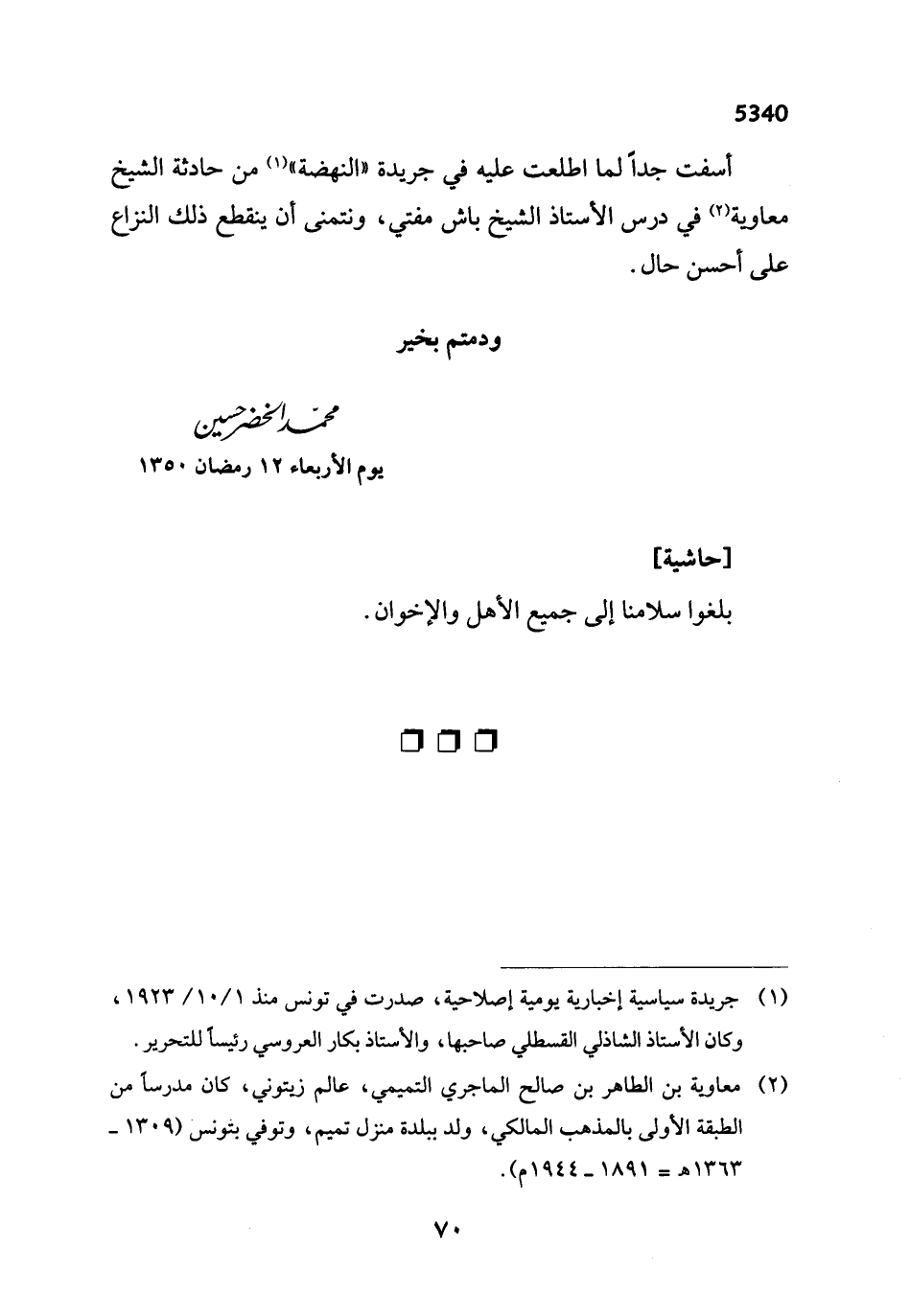 أسفت جداً لما اطلعت عليه في جريدة "النهضة" (¬1) من حادثة الشيخ معاوية (¬2) في درس الأستاذ الشيخ باش مفتي، ونتمنى أن ينقطع ذلك النزاع على أحسن حال.
