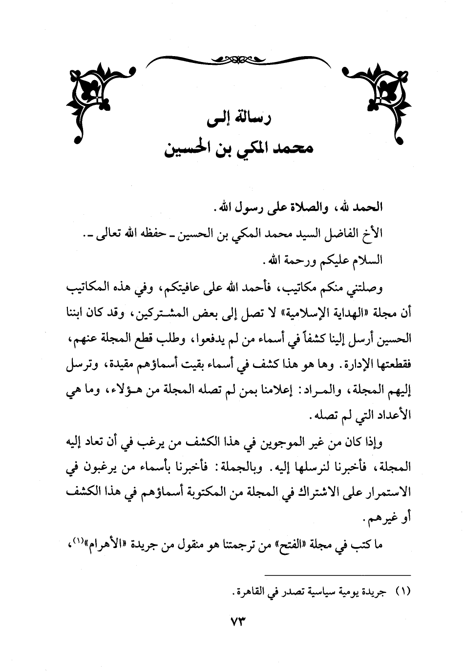 وصلتني منكم مكاتيب، فأحمد الله على عافيتكم، وفي هذه المكاتيب أن مجلة "الهداية الإسلامية" لا تصل إلى بعض المشتركين، وقد كان ابننا الحسين أرسل إلينا كشفاً في أسماء من لم يدفعوا، وطلب قطع المجلة عنهم، فقطعتها الإدارة. وها هو هذا كشف في أسماء بقيت أسماؤهم مقيدة، وترسل إليهم المجلة، والمراد: إعلامنا بمن لم تصله المجلة من هؤلاء، وما هي الأعداد التي لم تصله.