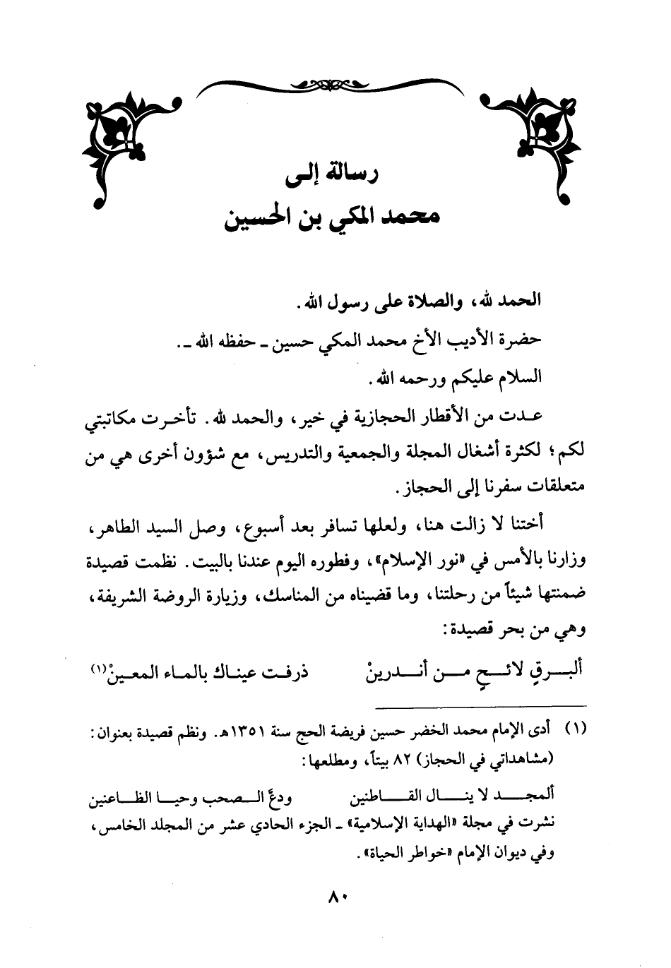 (¬1) أدى الإمام محمد الخضر حسين فريضة الحج سنة 1351 هـ. ونظم قصيدة بعنوان: (مشاهداتي في الحجاز) 82 بيتاً، ومطلعها: