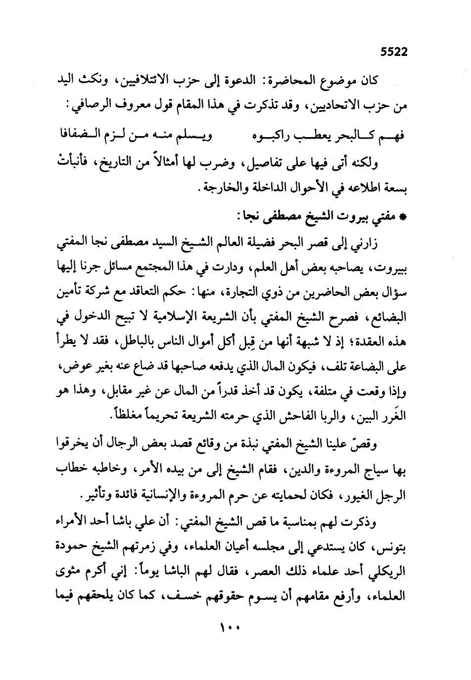 زارني إلى قصر البحر فضيلة العالم الشيخ السيد مصطفى نجا المفتي ببيروت، يصاحبه بعض أهل العلم، ودارت في هذا المجتمع مسائل جرنا إليها سؤال بعض الحاضرين من ذوي التجارة، منها: حكم التعاقد مع شركة تأمين البضائع، فصرح الشيخ المفتي بأن الشريعة الإسلامية لا تبيح الدخول في هذه العقدة؛ إذ لا شبهة أنها من قِبل أكل أموال الناس بالباطل، فقد لا يطرأ على البضاعة تلف، فيكون المال الذي يدفعه صاحبها قد ضاع عنه بغير عوض، وإذا وقعت في متلفة، يكون قد أخذ قدراً من المال عن غير مقابل، وهذا هو الغَرر البين، والربا الفاحش الذي حرمته الشريعة تحريماً مغلظاً.