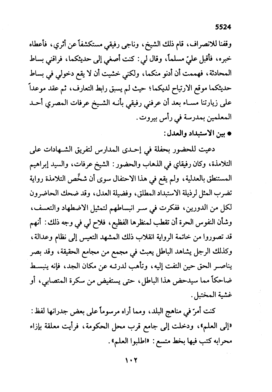 وقفنا للانصراف، قام ذلك الشيخ، وناجى رفيقي مستكشفاً عن أثري، فأعطاه خبره، فأقبل عليّ مسلماً، وقال لي: كنت أصغي إلى حديثكما، فراقني بساط المحادثة، فهممت أن أدنو منكما، ولكني خشيت أن لا يقع دخولي في بساط حديثكما موقع الارتياح لديكما، حيث لم يسبق رابط التعارف، ثم عقد موعداً على زيارتنا مساء بعد أن عرفني رفيقي بأنه الشيخ عرفات المصري أحد المعلمين بمدرسة في رأس بيروت.