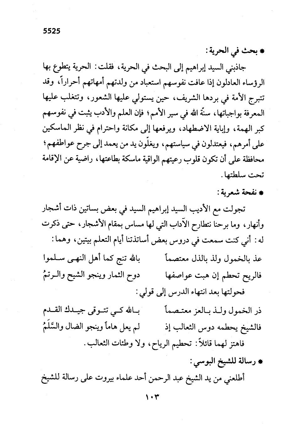 جاذبني السيد إبراهيم إلى البحث في الحرية، فقلت: الحرية يتطوع بها الرؤساء العادلون إذا عافت نفوسهم استعباد من ولدتهم أمهاتهم أحراراً، وقد تتبرج الأمة في بردها الشريف، حين يستولي عليها الشعور، وتتغلب عليها المعرفة بواجباتها، سنّة الله في سير الأمم؛ فإن العلم والأدب يثبت في نفوسهم أكبر الهمة، وإباية الاضطهاد، ويرفعها إلى مكانة واحترام في نظر الماسكين على أمرهم، فيعتدلون في سياستهم، ويغلّون يد من يعمد إلى جرح عواطفهم؛ محافظة على أن تكون قلوب رعيتهم الواقية ماسكة بطاعتها، راضية عن الإقامة تحت سلطتها.