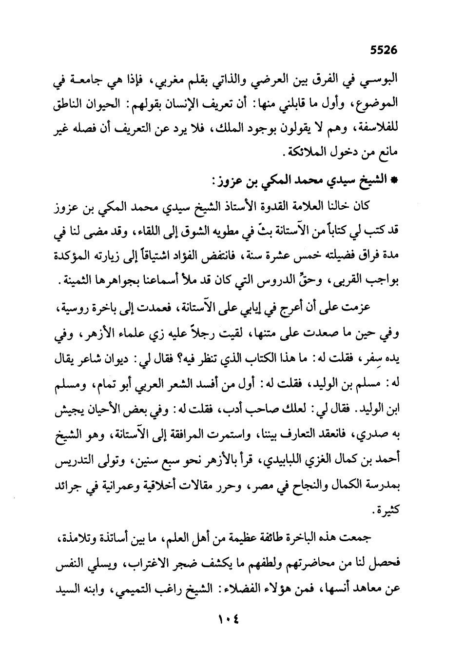 كان خالنا العلامة القدوة الأستاذ الشيخ سيدي محمد المكي بن عزوز قد كتب لي كتاباً من الآستانة بثّ في مطويه الشوق إلى اللقاء، وقد مضى لنا في مدة فراق فضيلته خمس عشرة سنة، فانتفض الفؤاد اشتياقاً إلى زيارته المؤكدة بواجب القربى، وحقِّ الدروس التي كان قد ملأ أسماعنا بجواهرها الثمينة.