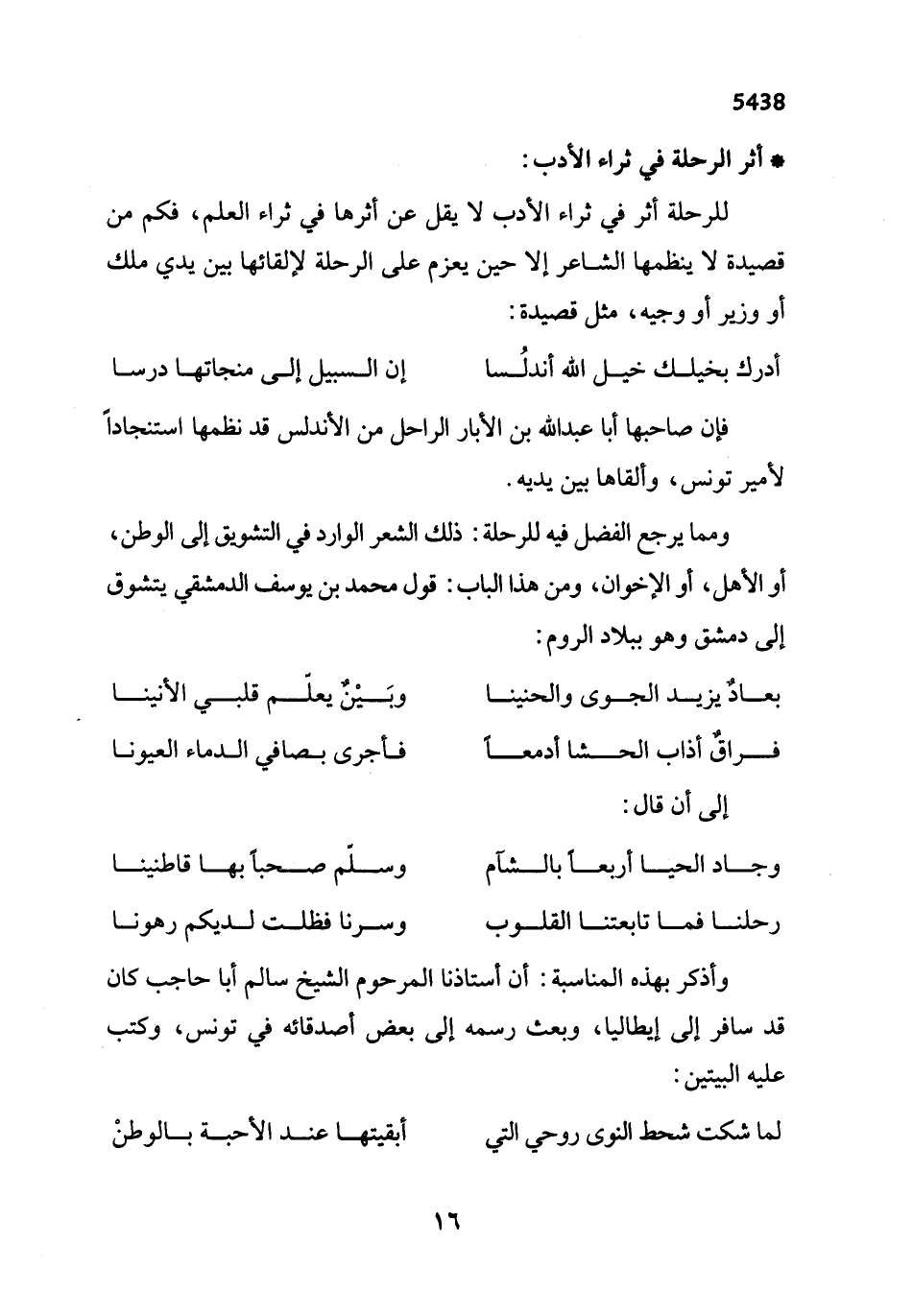 للرحلة أثر في ثراء الأدب لا يقل عن أثرها في ثراء العلم، فكم من قصيدة لا ينظمها الشاعر إلا حين يعزم على الرحلة لإلقائها بين يدي ملك أو وزير أو وجيه، مثل قصيدة: