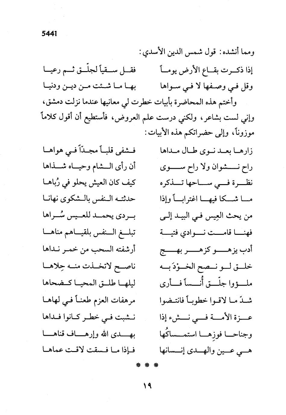 وأختم هذه المحاضرة بأبيات خطرت لي معانيها عندما نزلت دمشق، وإني لست بشاعر، ولكني درست علم العروض، فأستطيع أن أقول كلاماً موزوناً، وإلى حضراتكم هذه الأبيات: