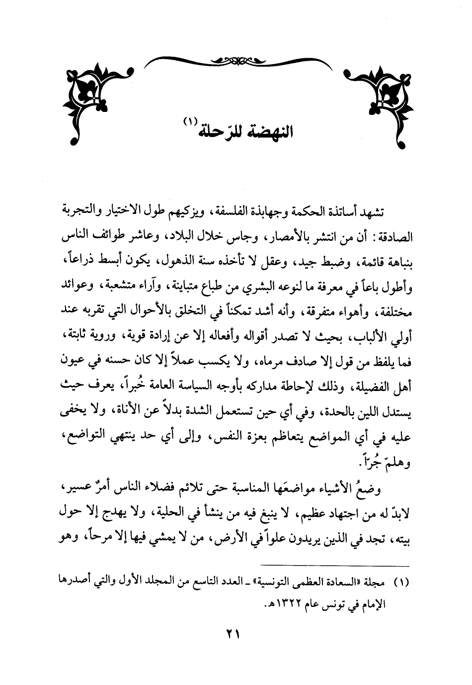 تشهد أساتذة الحكمة وجهابذة الفلسفة، ويزكيهم طول الاختيار والتجربة الصادقة: أن من انتشر بالأمصار، وجاس خلال البلاد، وعاشر طوائف الناس بنباهة قائمة، وضبط جيد، وعقل لا تأخذه سنة الذهول، يكون أبسط ذراعاً، وأطول باعاً في معرفة ما لنوعه البشري من طباع متباينة، وآراء متشعبة، وعوائد مختلفة، وأهواء متفرقة، وأنه أشد تمكناً في التخلق بالأحوال التي تقربه عند أولي الألباب، بحيث لا تصدر أقواله وأفعاله إلا عن إرادة قوية، وروية ثابتة، فما يلفظ من قول إلا صادف مرماه، ولا يكسب عملاً إلا كان حسنه في عيون أهل الفضيلة، وذلك لإحاطة مداركه بأوجه السياسة العامة خُبراً، يعرف حيث يستدل اللين بالحدة، وفي أي حين تستعمل الشدة بدلاً عن الأناة، ولا يخفى عليه في أي المواضع يتعاظم بعزة النفس، وإلى أي حد ينتهي التواضع، وهلمّ جُرّاً.