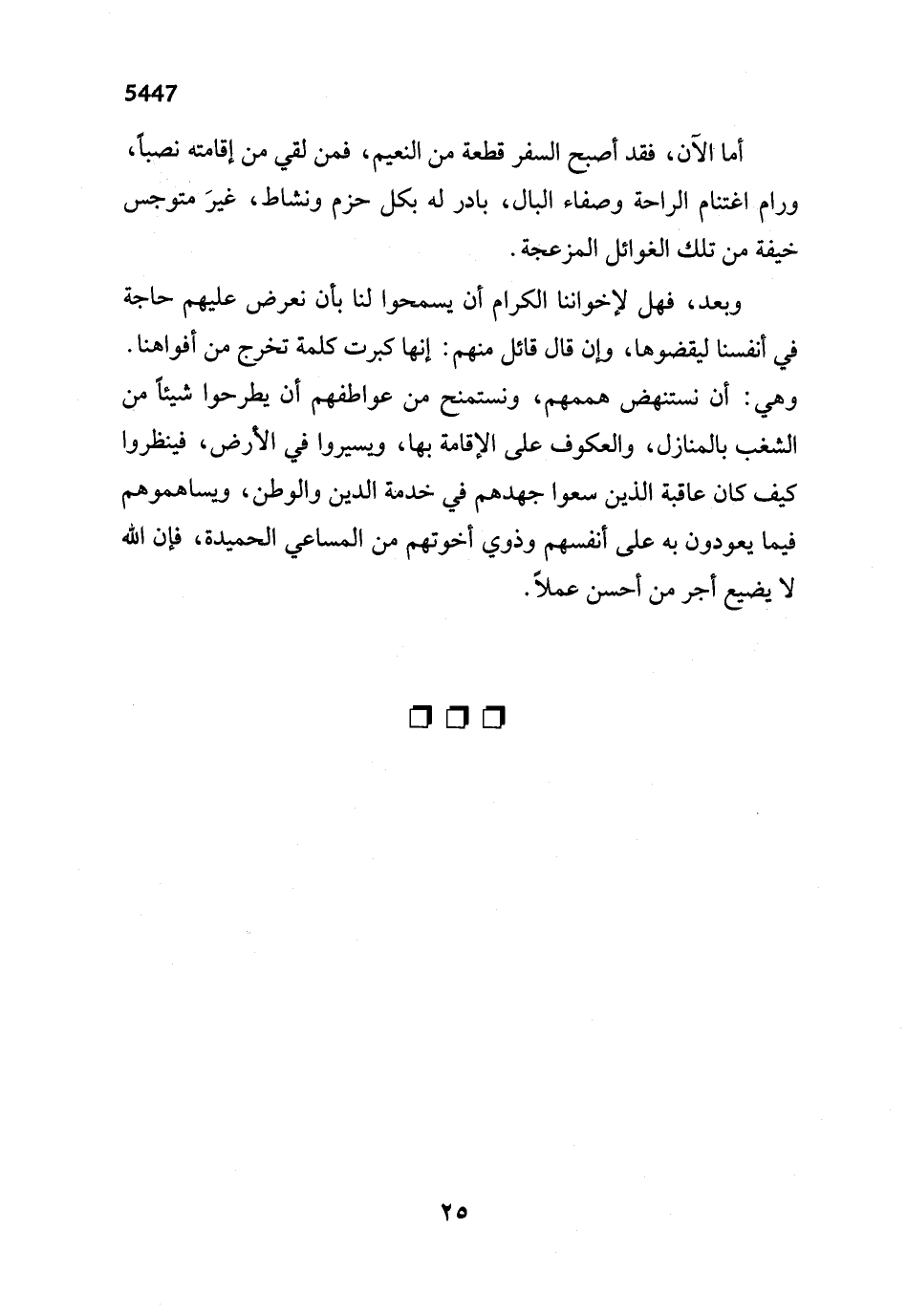 وبعد، فهل لإخواننا الكرام أن يسمحوا لنا بأن نعرض عليهم حاجة في أنفسنا ليقضوها، وإن قال قائل منهم: إنها كبرت كلمة تخرج من أفواهنا. وهي: أن نستنهض هممهم، ونستمنح من عواطفهم أن يطرحوا شيئاً من الشغب بالمنازل، والعكوف على الإقامة بها، ويسيروا في الأرض، فينظروا كيف كان عاقبة الذين سعوا جهدهم في خدمة الدين والوطن، ويساهموهم فيما يعودون به على أنفسهم وذوي أخوتهم من المساعي الحميدة، فإن الله لا يضيع أجر من أحسن عملاً.