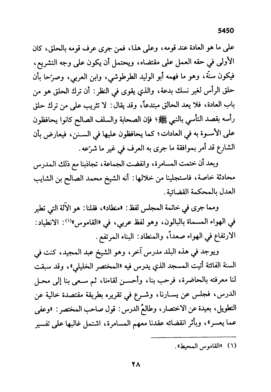 على ما هو العادة عند قومه، وعلى هذا، فمن جرى عرف قومه بالحلق، كان الأولى في حقه العمل على مقتضاه، ويحتمل أن يكون على وجه التشريع، فيكون سنّة، وهو ما فهمه أَبو الوليد الطرطوشي، وابن العربي، وصرّحا بأن حلق الرأس لغير نسك بدعة، والذي يقوى في النظر: أن ترك الحلق هو من باب العادة، فلا يعد الحالق مبتدعاً، وقد يقال: لا تثريب على من ترك حلق رأسه بقصد التأسي بالنبي - صلى الله عليه وسلم -؛ فإن الصحابة والسلف الصالح كانوا يحافظون على الأسوة به في العادات؛ كما يحافظون عليها في السنن، فيعارض بأن الشارع قد أمر بموافقة ما جرى به العرف في غير ما شرّعه.