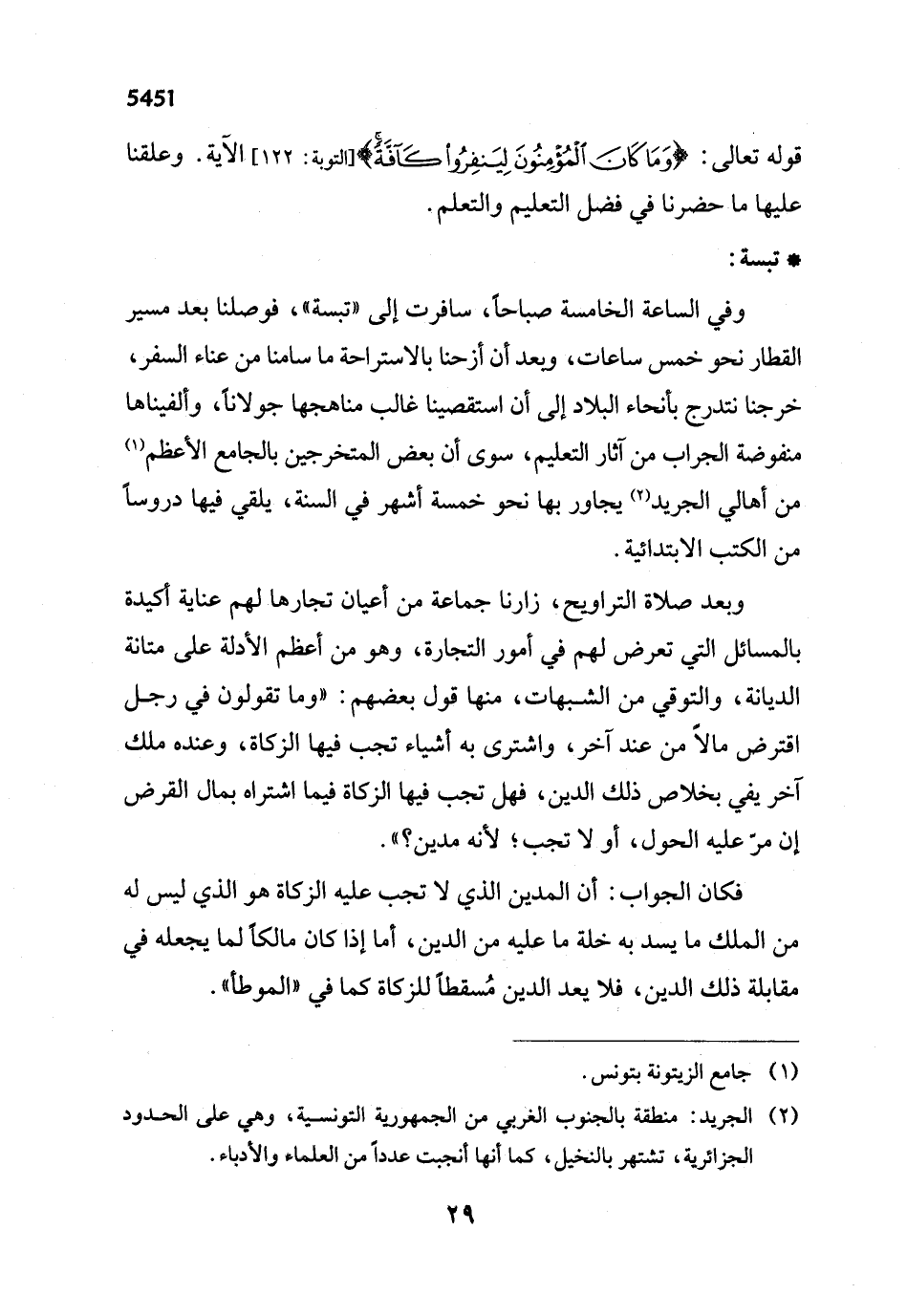 وفي الساعة الخامسة صباحاً، سافرت إلى "تبسة"، فوصلنا بعد مسير القطار نحو خمس ساعات، ويعد أن أزحنا بالاستراحة ما سامنا من عناء السفر، خرجنا نتدرج بأنحاء البلاد إلى أن استقصينا غالب مناهجها جولاناً، وألفيناها منفوضة الجراب من آثار التعليم، سوى أن بعض المتخرجين بالجامع الأعظم (¬1) من أهالي الجريد (¬2) يجاور بها نحو خمسة أشهر في السنة، يلقي فيها دروساً من الكتب الابتدائية.