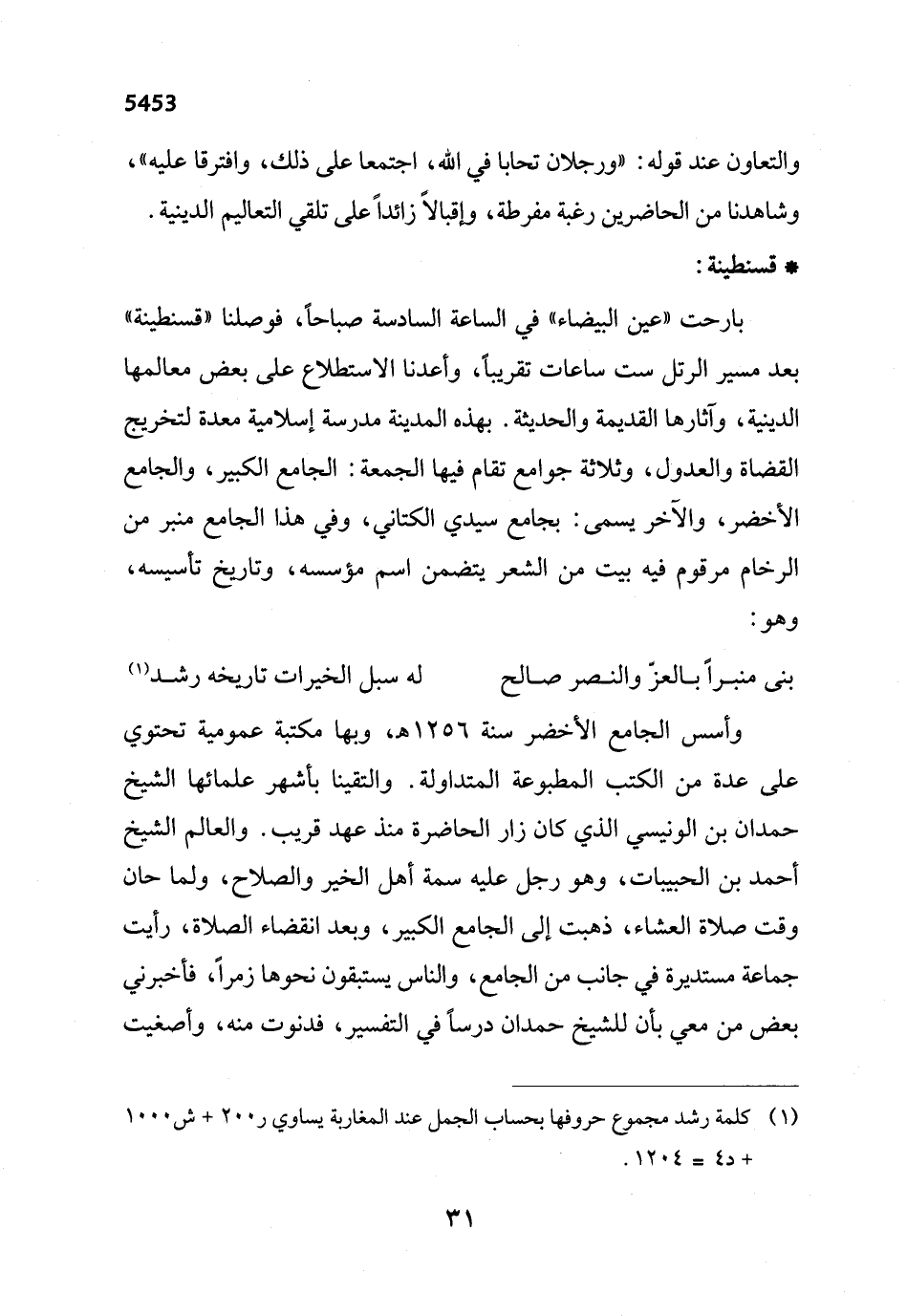 بارحت "عين البيضاء" في الساعة السادسة صباحاً، فوصلنا "قسنطينة" بعد مسير الرتل ست ساعات تقريباً، وأعدنا الاستطلاع على بعض معالمها الدينية، وآثارها القديمة والحديثة. بهذه المدينة مدرسة إسلامية معدة لتخريج القضاة والعدول، وثلاثة جوامع تقام فيها الجمعة: الجامع الكبير، والجامع الأخضر، والآخر يسمى: بجامع سيدي الكتاني، وفي هذا الجامع منبر من الرخام مرقوم فيه بيت من الشعر يتضمن اسم مؤسسه، وتاريخ تأسيسه، وهو: