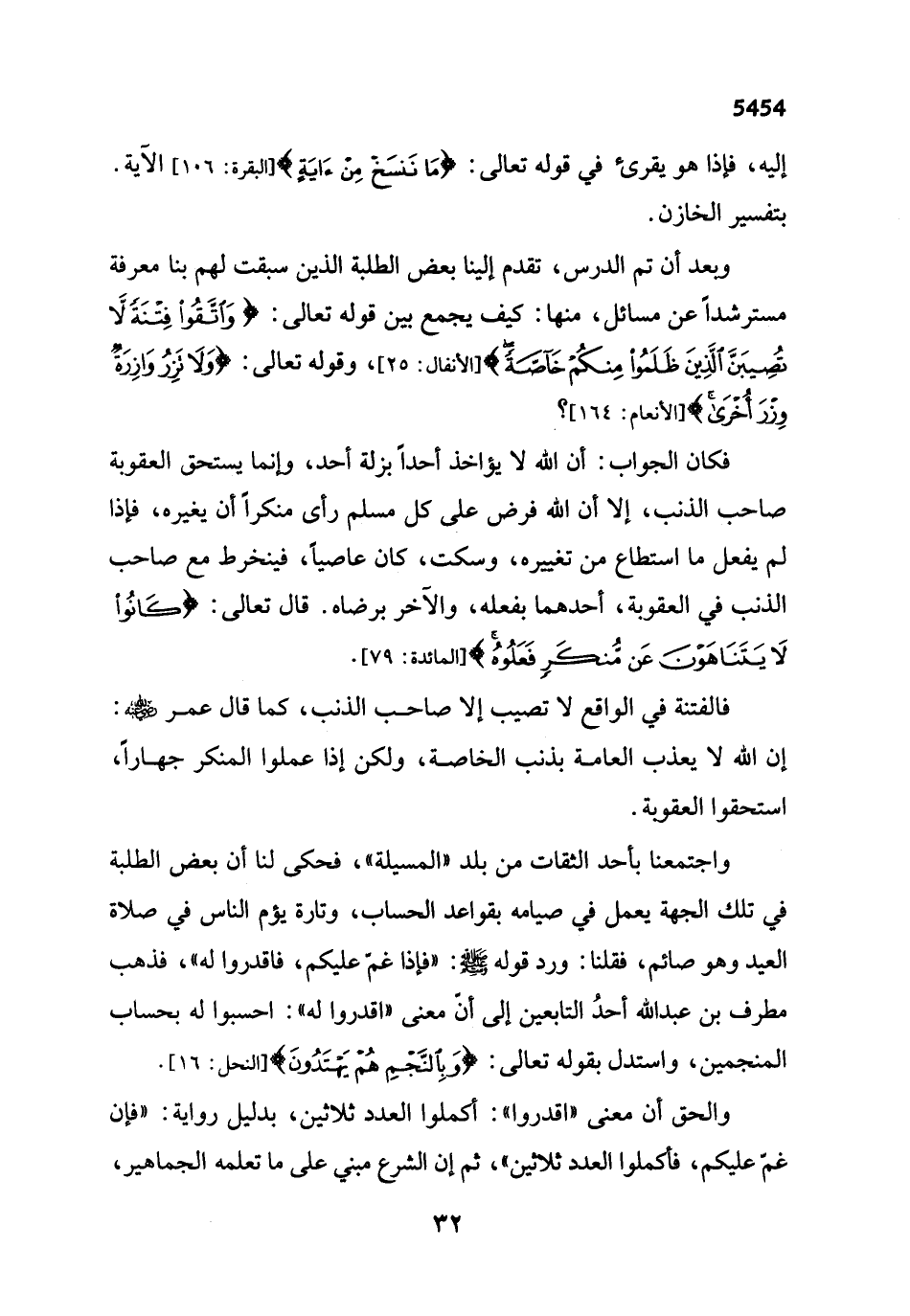 وبعد أن تم الدرس، تقدم إلينا بعض الطلبة الذين سبقت لهم بنا معرفة مسترشداً عن مسائل، منها: كيف يجمع بين قوله تعالى: {وَاتَّقُوا فِتْنَةً لَا تُصِيبَنَّ الَّذِينَ ظَلَمُوا مِنْكُمْ خَاصَّةً} [الأنفال: 25]، وقوله تعالى: {وَلَا تَزِرُ وَازِرَةٌ وِزْرَ أُخْرَى} [الأنعام: 164]؟