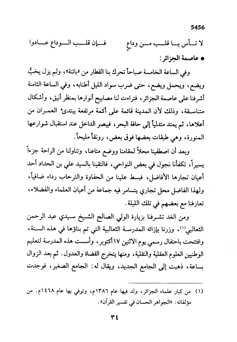 وفي الساعة الخامسة صباحا تحرك بنا القطار من "باتنة"، ولم يزل يخبُّ ويضع، ويحمل ويضع، حتى ضرب سواد الليل أطنابه، وفي الساعة الثامنة أشرفنا على عاصمة الجزائر، فتراءت لنا مصابيح أنوارها بمنظر أنيق، وأشكال متناسقة، وذلك لأن المدينة قائمة على أكمة مرتفعة يبتدئ العمران من أعلاها، ثم يمتد متدلياً إلى حافة البحر، فيبصر الداخل عند استقبال شوارعها المنورة، وهي طبقات بعضها فوق بعض، رونقاً مليحاً.