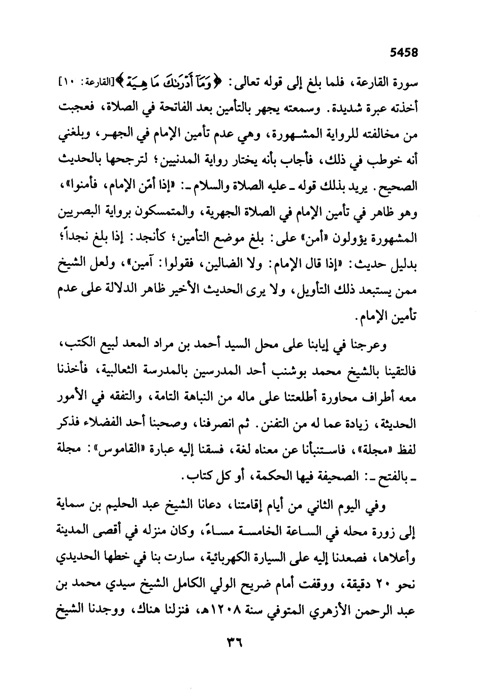 سورة القارعة، فلما بلغ إلى قوله تعالى: {وَمَا أَدْرَاكَ مَا هِيَهْ} [القارعة: 10] أخذته عبرة شديدة. وسمعته يجهر بالتأمين بعد الفاتحة في الصلاة، فعجبت من مخالفته للرواية المشهورة، وهي عدم تأمين الإمام في الجهر، وبلغني أنه خوطب في ذلك، فأجاب بأنه يختار رواية المدنيين؛ لترجحها بالحديث الصحيح. يريد بذلك قوله - عليه الصلاة والسلام -: "إذا أمّن الإمام، فأمنوا"، وهو ظاهر في تأمين الإمام في الصلاة الجهرية، والمتمسكون برواية البصريين المشهورة يؤولون "أمن" على: بلغ موضع التأمين؛ كأنجد: إذا بلغ نجداً؛ بدليل حديث: "إذا قال الإمام: ولا الضالين، فقولوا: آمين"، ولعل الشيخ ممن يستبعد ذلك التأويل، ولا يرى الحديث الأخير ظاهر الدلالة على عدم تأمين الإمام.