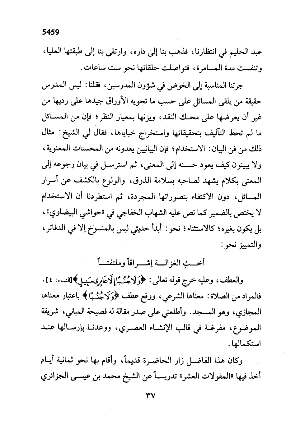 والعطف، وعليه خرج قوله تعالى: {وَلَا جُنُبًا إِلا عَابِرِي سَبِيلٍ} [النساء: 4]. فالمراد من الصلاة: معناها الشرعي، ووقع عطف {وَلَا جُنُبًا} باعتبار معناها المجازي، وهو المسجد. وأطلعني على صدر مقالة له فصيحة المباني، شريفة الموضوع، مفرغة في قالب الإنشاء العصري، ووعدنا بإرسالها عند استكمالها.