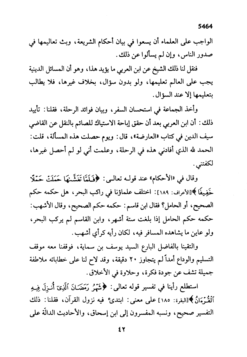 وأخذ الجماعة في استحسان السفر، وييان فوائد الرحلة، فقلنا: تأييد ذلك: أن ابن العربي بعد أن حقق إباحة الاستياك للصائم بالنقل عن القاضي سيف الدين في كتاب "العارضة" قال: ويوم حصلت هذه المسألة، قلت: الحمد لله الذي أفادني هذه في الرحلة، وعلمت أني لو لم أحصل غيرها، لكفتني.