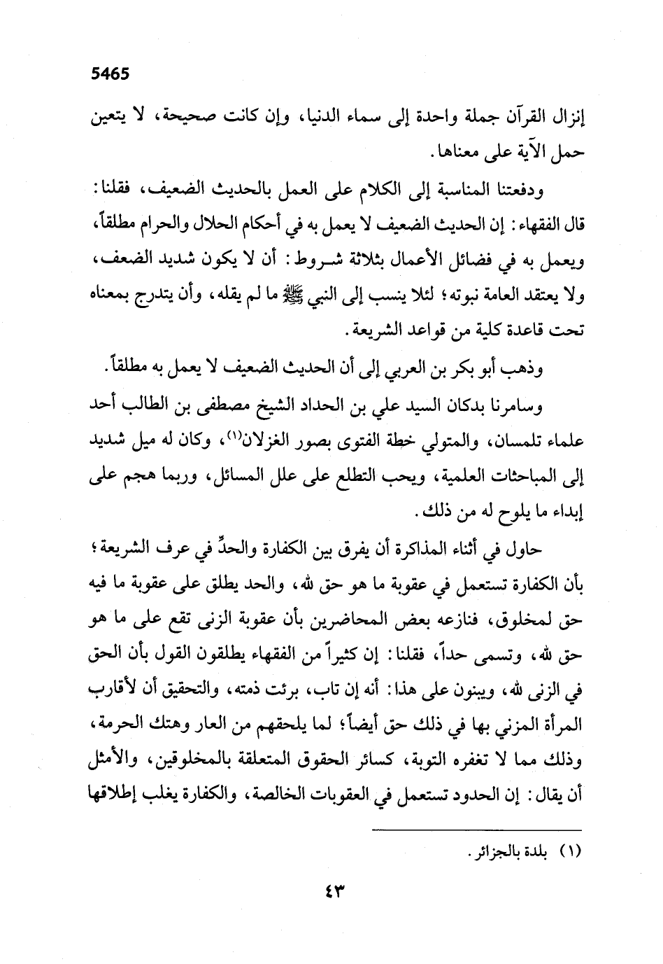 وذهب أبو بكر بن العربي إلى أن الحديث الضعيف لا يعمل به مطلقاً. وسامرنا بدكان السيد علي بن الحداد الشيخ مصطفى بن الطالب أحد علماء تلمسان، والمتولي خطة الفتوى بصور الغزلان (¬1)، وكان له ميل شديد إلى المباحثات العلمية، ويحب التطلع على علل المسائل، وربما هجم على إبداء ما يلوح له من ذلك.