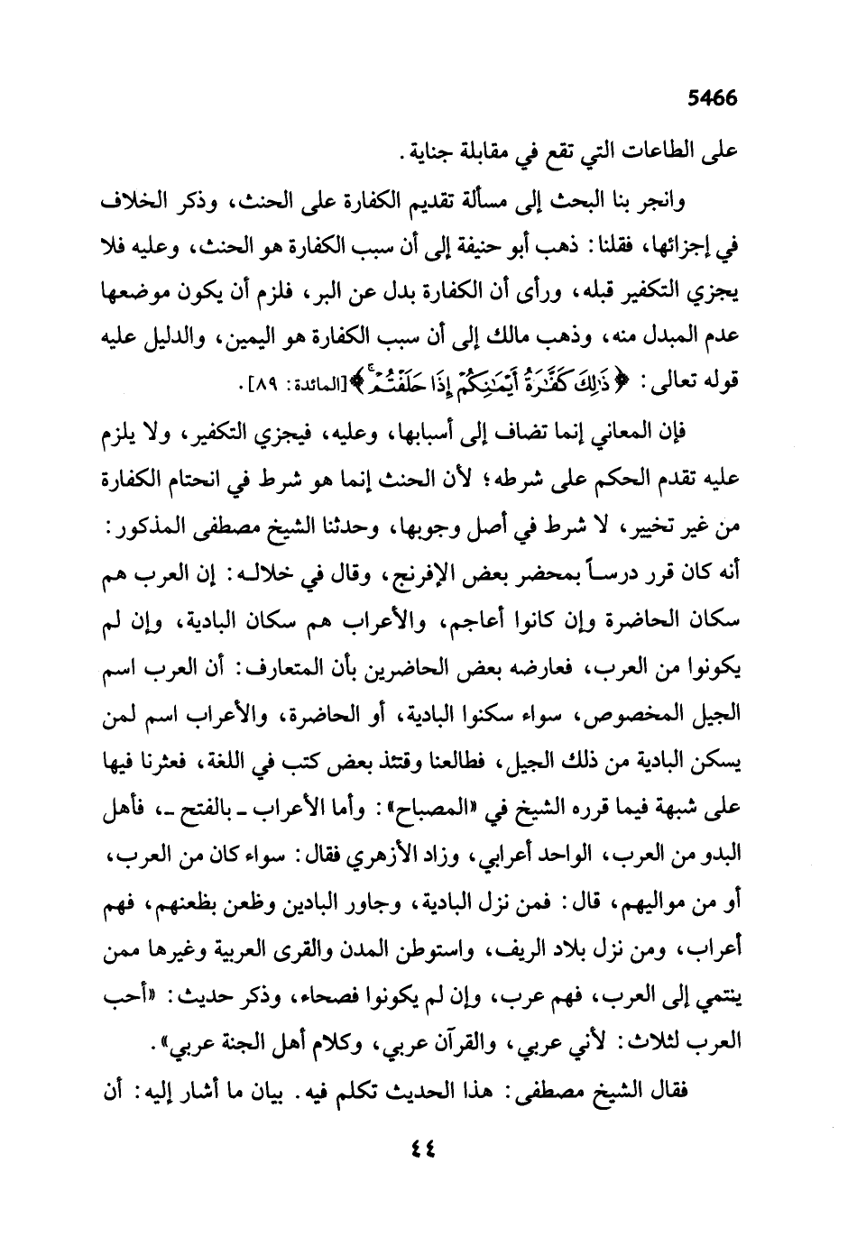فإن المعاني إنما تضاف إلى أسبابها، وعليه، فيجزي التكفير، ولا يلزم عليه تقدم الحكم على شرطه؛ لأن الحنث إنما هو شرط في انحتام الكفارة من غير تخيير، لا شرط في أصل وجوبها، وحدثنا الشيخ مصطفى المذكور: أنه كان قرر درساً بمحضر بعض الإفرنج، وقال في خلاله: إن العرب هم سكان الحاضرة وإن كانوا أعاجم، والأعراب هم سكان البادية، وإن لم يكونوا من العرب، فعارضه بعض الحاضرين بأن المتعارف: أن العرب اسم الجيل المخصوص، سواء سكنوا البادية، أو الحاضرة، والأعراب اسم لمن يسكن البادية من ذلك الجيل، فطالعنا وقتئذ بعض كتب في اللغة، فعثرنا فيها على شبهة فيما قرره الشيخ في "المصباح": وأما الأعراب -بالفتح-، فأهل البدو من العرب، الواحد أعرابي، وزاد الأزهري فقال: سواء كان من العرب، أو من مواليهم، قال: فمن نزل البادية، وجاور البادين وظعن بظعنهم، فهم أعراب، ومن نزل بلاد الريف، واستوطن المدن والقرى العربية وغيرها ممن ينتمي إلى العرب، فهم عرب، وإن لم يكونوا فصحاء، وذكر حديث: "أحب العرب لثلاث: لأني عربي، والقرآن عربي، وكلام أهل الجنة عربي".
