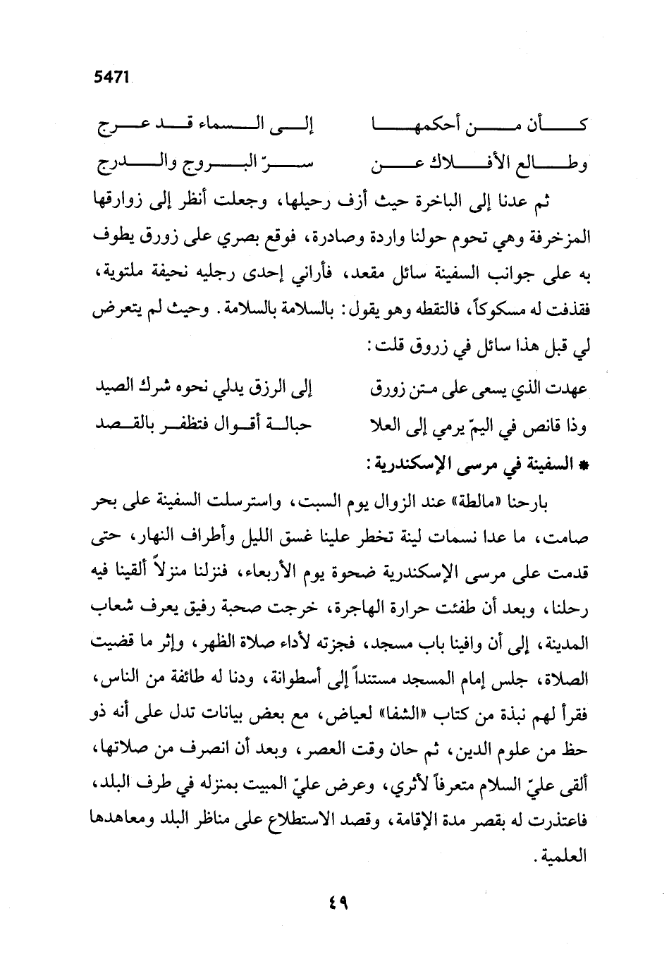بارحنا "مالطة" عند الزوال يوم السبت، واسترسلت السفينة على بحر صامت، ما عدا نسمات لينة تخطر علينا غسق الليل وأطراف النهار، حتى قدمت على مرسى الإسكندرية ضحوة يوم الأربعاء، فنزلنا منزلاً ألقينا فيه رحلنا، وبعد أن طفئت حرارة الهاجرة، خرجت صحبة رفيق يعرف شعاب المدينة، إلى أن وافينا باب مسجد، فجزته لأداء صلاة الظهر، وإثر ما قضيت الصلاة، جلس إمام المسجد مستنداً إلى أسطوانة، ودنا له طائفة من الناس، فقرأ لهم نبذة من كتاب "الشفا" العياض، مع بعض بيانات تدل على أنه ذو حظ من علوم الدين، ثم حان وقت العصر، وبعد أن انصرف من صلاتها، ألقى عليّ السلام متعرفاً لأثري، وعرض عليّ المبيت بمنزله في طرف البلد، فاعتذرت له بقصر مدة الإقامة، وقصد الاستطلاع على مناظر البلد ومعاهدها العلمية.