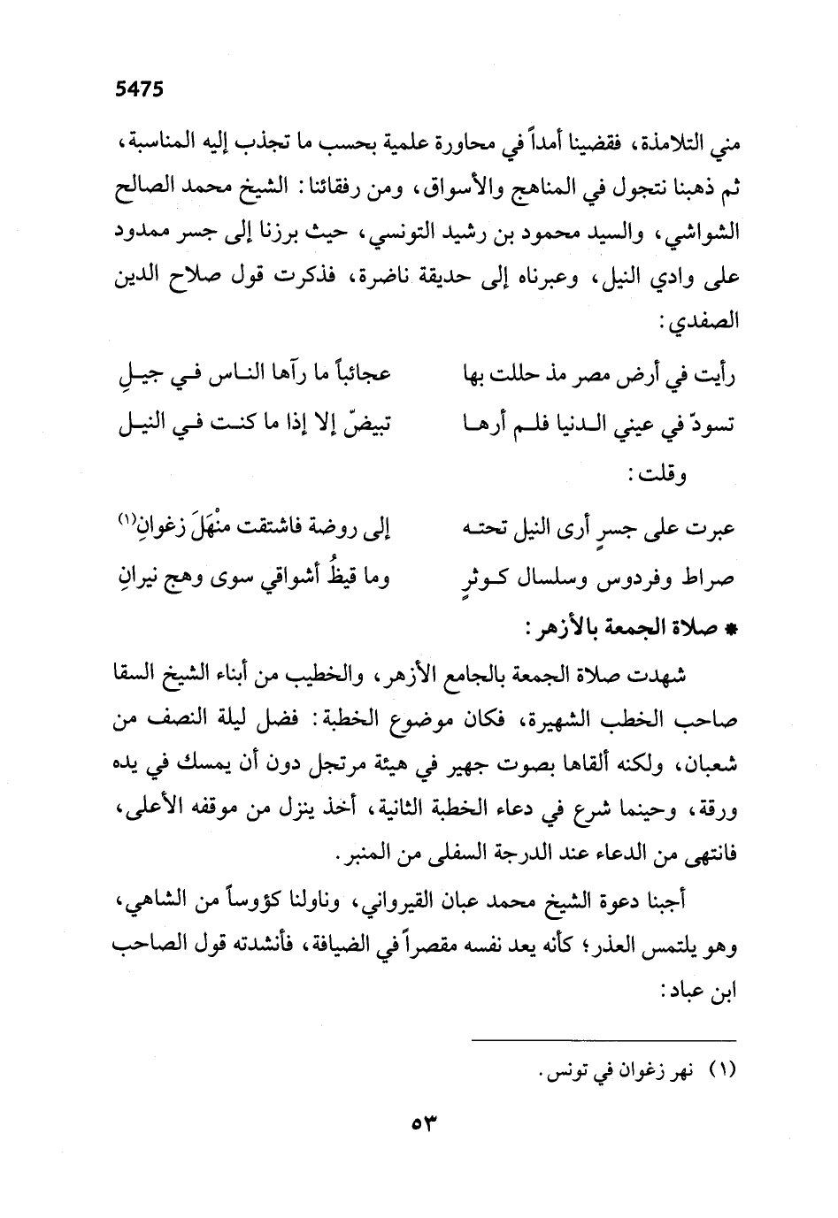 مني التلامذة، فقضينا أمداً في محاورة علمية بحسب ما تجذب إليه المناسبة، ثم ذهبنا نتجول في المناهج والأسواق، ومن رفقائنا: الشيخ محمد الصالح الشواشي، والسيد محمود بن رشيد التونسي، حيث برزنا إلى جسر ممدود على وادي النيل، وعبرناه إلى حديقة ناضرة، فذكرت قول صلاح الدين الصفدي: