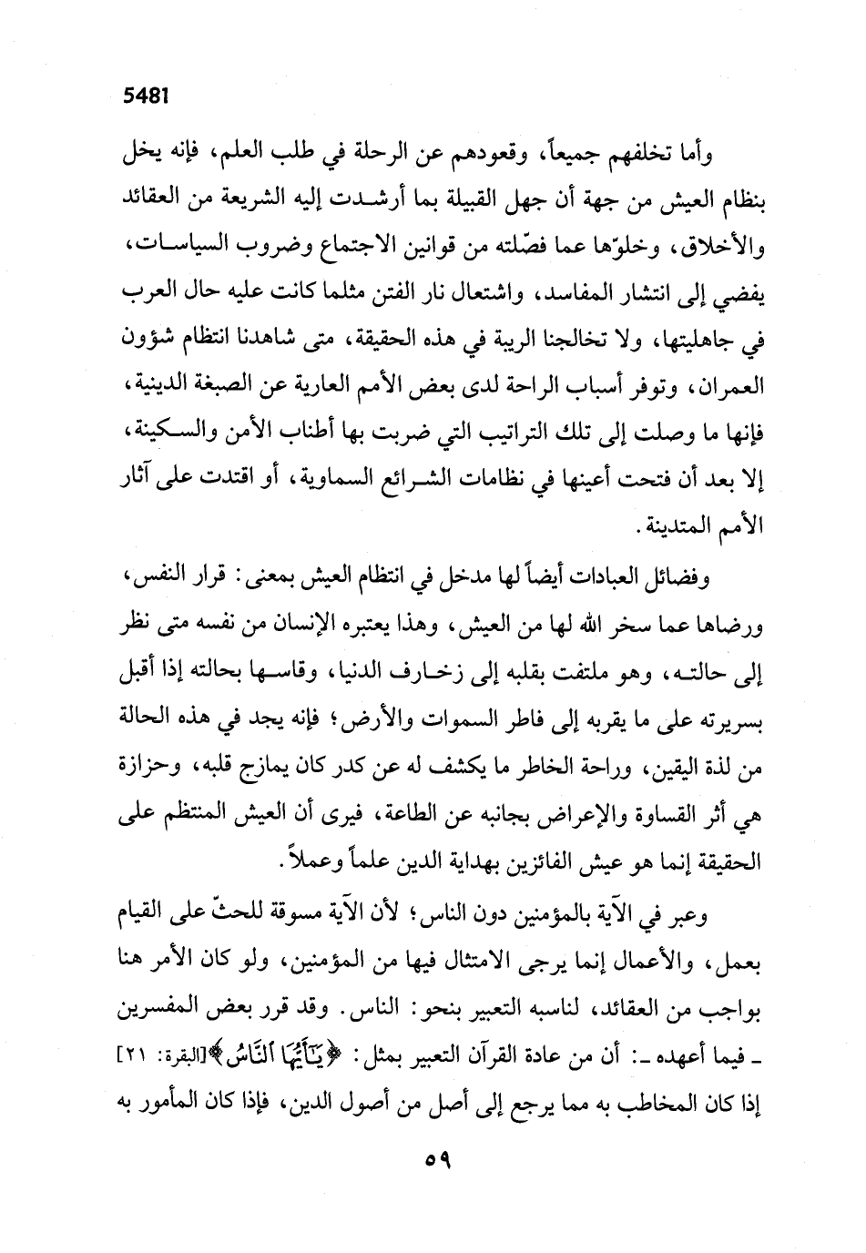 وأما تخلفهم جميعاً، وقعودهم عن الرحلة في طلب العلم، فإنه يخل بنظام العيش من جهة أن جهل القبيلة بما أرشدت إليه الشريعة من العقائد والأخلاق، وخلوّها عما فصّلته من قوانين الاجتماع وضروب السياسات، يفضي إلى انتشار المفاسد، واشتعال نار الفتن مثلما كانت عليه حال العرب في جاهليتها، ولا تخالجنا الريبة في هذه الحقيقة، متى شاهدنا انتظام شؤون العمران، وتوفر أسباب الراحة لدى بعض الأمم العارية عن الصبغة الدينية، فإنها ما وصلت إلى تلك التراتيب التي ضربت بها أطناب الأمن والسكينة، إلا بعد أن فتحت أعينها في نظامات الشرائع السماوية، أو اقتدت على آثار الأمم المتدينة.