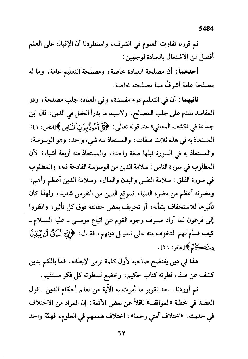 ثانيهما: أن في التعليم درء مفسدة، وفي العبادة جلب مصلحة، ودر المفاسد مقدم على جلب المصالح، ولا سيما ما يدرأ الخلل في الدين، قال ابن جماعة في "كشف المعاني" عند قوله تعالى: {قُلْ أَعُوذُ بِرَبِّ النَّاسِ} [الناس: 1]: المستعاذ به في هذه ثلاث صفات، والمستعاذ منه شيء واحد، وهو الوسوسة، والمستعاذ به في السورة قبلها صفة واحدة، والمستعاذ منه أربعة أشياء؛ لأن المطلوب في سورة الناس: سلامة الدين من الوسوسة القادحة فيه، والمطلوب في سورة الفلق: سلامة النفس والبدن والمال، وسلامة الدين أعظم وأهم، ومضرته أعظم من مضرة الدنيا، فموقع الدين من النفوس شديد، ولهذا كان تأثيرها للاستخفاف بشأنه، أو تحريف بعض حقائقه فوق كل تأثير، وانظروا إلى فرعون لما أراد صرف وجوه القوم عن اتباع موسى - عليه السلام - كيف قدّم لهم التخوف منه على تبديل دينهم، فقال: {إِنِّي أَخَافُ أَنْ يُبَدِّلَ دِينَكُمْ} [غافر: 26].