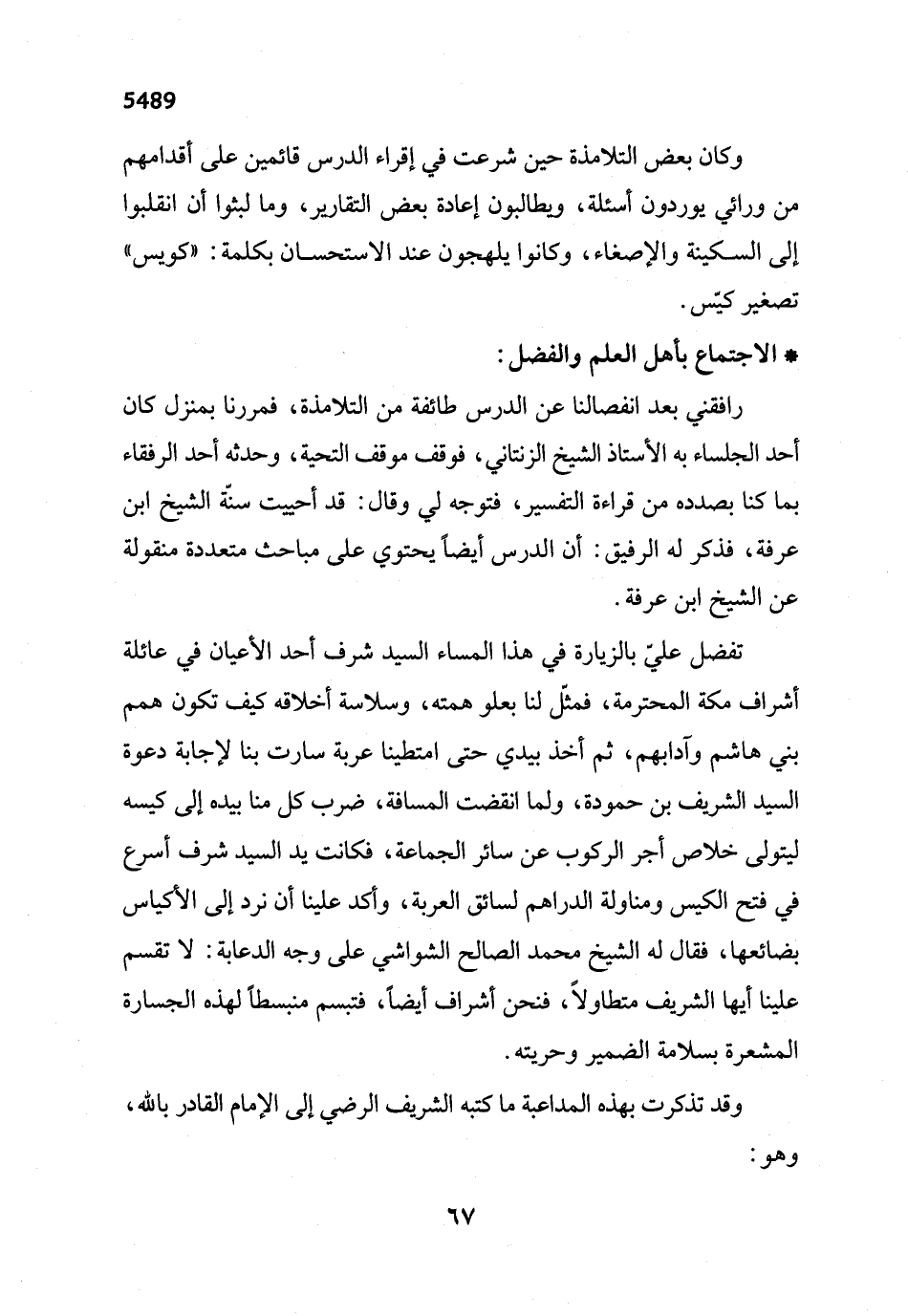تفضل عليّ بالزيارة في هذا المساء السيد شرف أحد الأعيان في عائلة أشراف مكة المحترمة، فمثّل لنا بعلو همته، وسلاسة أخلاقه كيف تكون همم بني هاشم وآدابهم، ثم أخذ بيدي حتى امتطينا عربة سارت بنا لإجابة دعوة السيد الشريف بن حمودة، ولما انقضت المسافة، ضرب كل منا بيده إلى كيسه ليتولى خلاص أجر الركوب عن سائر الجماعة، فكانت يد السيد شرف أسرع في فتح الكيس ومناولة الدراهم لسائق العربة، وأكد علينا أن نرد إلى الأكياس بضائعها، فقال له الشيخ محمد الصالح الشواشي على وجه الدعابة: لا تقسم علينا أيها الشريف متطاولاً، فنحن أشراف أيضاً، فتبسم منبسطاً لهذه الجسارة المشعرة بسلامة الضمير وحريته.