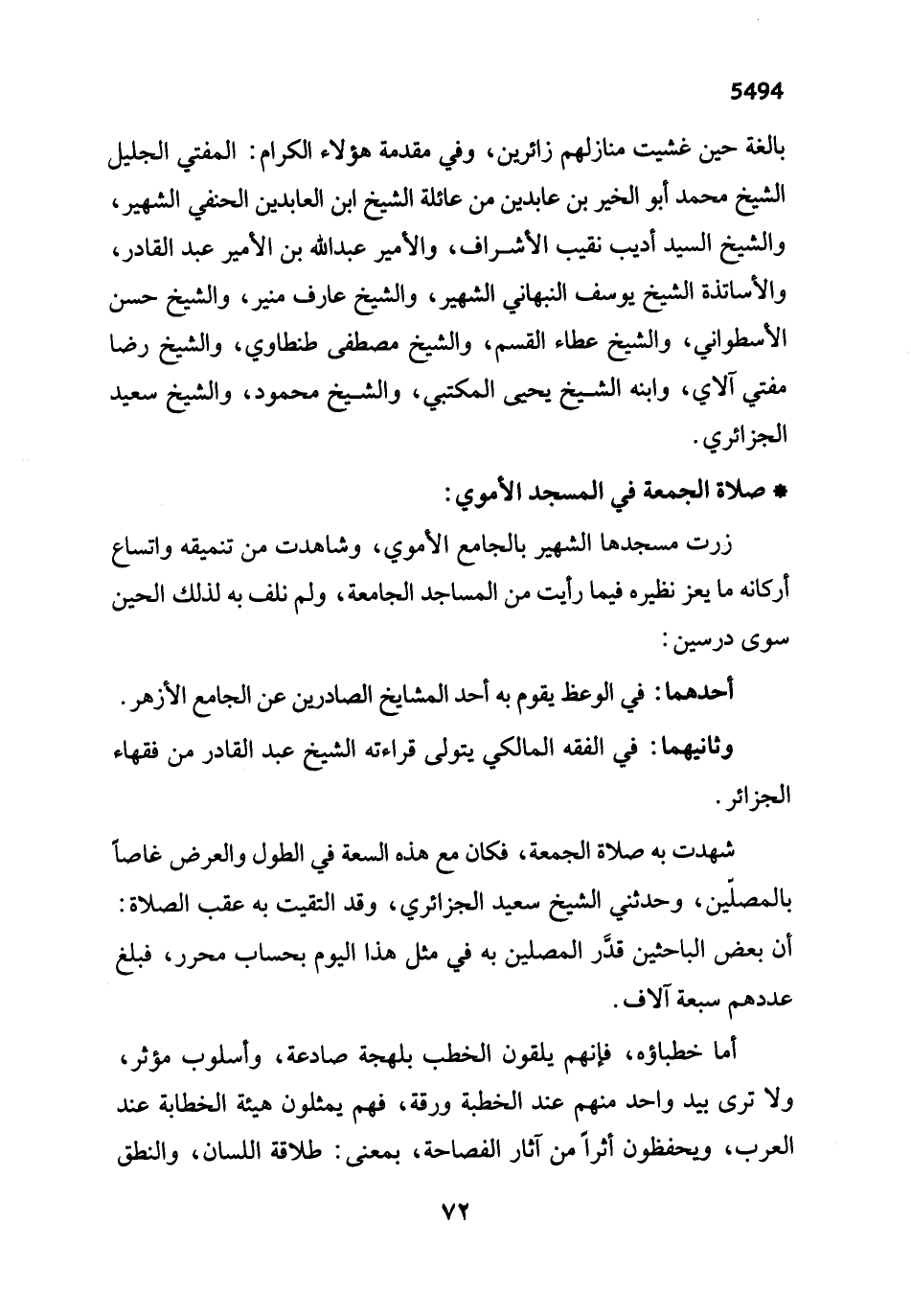 شهدت به صلاة الجمعة، فكان مع هذه السعة في الطول والعرض غاصاً بالمصلّين، وحدثني الشيخ سعيد الجزائري، وقد التقيت به عقب الصلاة: أن بعض الباحثين قدَّر المصلين به في مثل هذا اليوم بحساب محرر، فبلغ عددهم سبعة آلاف.