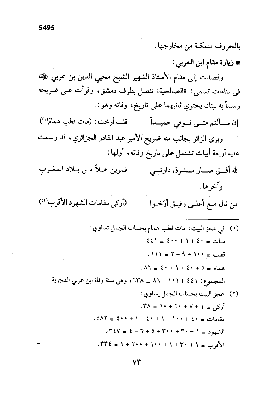 وقصدت إلى مقام الأستاذ الشهير الشيخ محي الدين بن عربي - رضي الله عنه - في بناءات تسمى: "الصالحية" تتصل بطرف دمشق، وقرأت على ضريحه رسماً به بيتان يحتوي ثانيهما على تاريخ، وفاته. وهو: