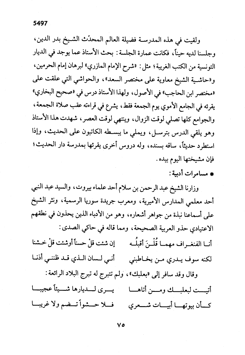 ولقيت في هذه المدرسة فضيلة العالم المحدّث الشيخ بدر الدين، وجلسنا لديه حيناً، فكانت عمارة الجلسة: بحث الأستاذ عما يوجد في الديار التونسية من الكتب الغريبة؛ مثل: "شرح الإمام المازري" لبرهان إمام الحرمين، و"حاشية الشيخ معاوية على مختصر السعد"، والحواشي التي علقت على "مختصر ابن الحاجب" في الأصول، ولهذا الأستاذ درس في "صحيح البخاري" يقرئه في الجامع الأموي يوم الجمعة فقط، يشرع في قراءته عقب صلاة الجمعة، والجوامع كلها تصلي لوقت الزوال، وينتهي لوقت العصر، شهدت هذا الأستاذ وهو يلقي الدرس بترسل، ويملي ما يبسطه الكاتبون على الحديث، وإذا استطرد حديثاً، ساقه بسنده، وله دروس أخرى يقرئها بمدرسة دار الحديث؛ فإن مشيختها اليوم بيده.