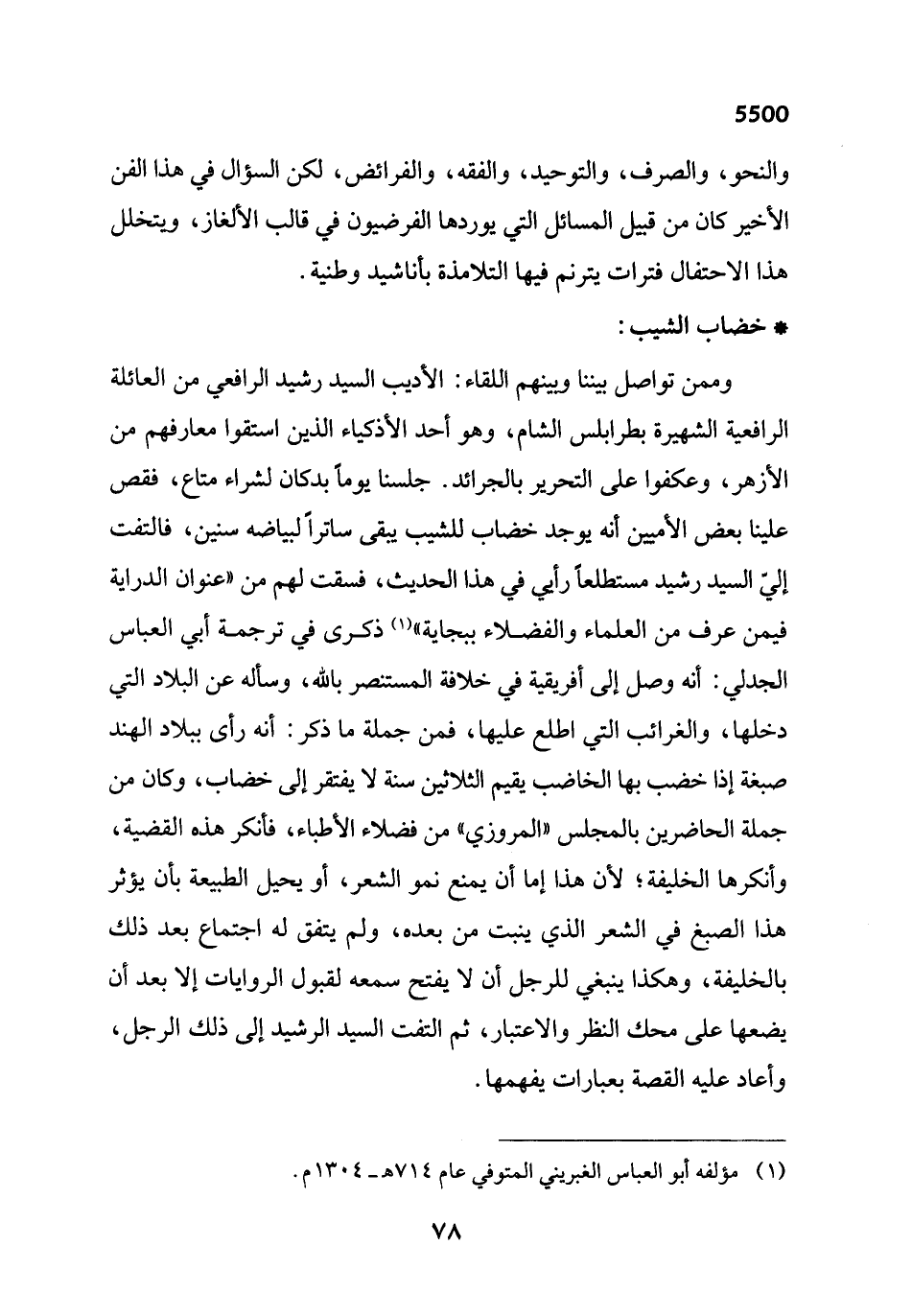 وممن تواصل بيننا وبينهم اللقاء: الأديب السيد رشيد الرافعي من العائلة الرافعية الشهيرة بطرابلس الشام، وهو أحد الأذكياء الذين استقوا معارفهم من الأزهر، وعكفوا على التحرير بالجرائد. جلسنا يوماً بدكان لشراء متاع، فقص علينا بعض الأميين أنه يوجد خضاب للشيب يبقى ساتراً لبياضه سنين، فالتفت إليّ السيد رشيد مستطلعاً رأي في هذا الحديث، فسقت لهم من "عنوان الدراية فيمن عرف من العلماء والفضلاء ببجاية" (¬1) ذكرى في ترجمة أبي العباس الجدلي: أنه وصل إلى أفريقية في خلافة المستنصر بالله، وسأله عن البلاد التي دخلها، والغرائب التي اطلع عليها، فمن جملة ما ذكر: أنه رأى ببلاد الهند صبغة إذا خضب بها الخاضب يقيم الثلاثين سنة لا يفتقر إلى خضاب، وكان من جملة الحاضرين بالمجلس "المروزي" من فضلاء الأطباء، فأنكر هذه القضية، وأنكرها الخليفة؛ لأن هذا إما أن يمنع نمو الشعر، أو يحيل الطبيعة بأن يؤثر هذا الصبغ في الشعر الذي ينبت من بعده، ولم يتفق له اجتماع بعد ذلك بالخليفة، وهكذا ينبغي للرجل أن لا يفتح سمعه لقبول الروايات إلا بعد أن يضعها على محك النظر والاعتبار، ثم التفت السيد الرشيد إلى ذلك الرجل، وأعاد عليه القصة بعبارات يفهمها.