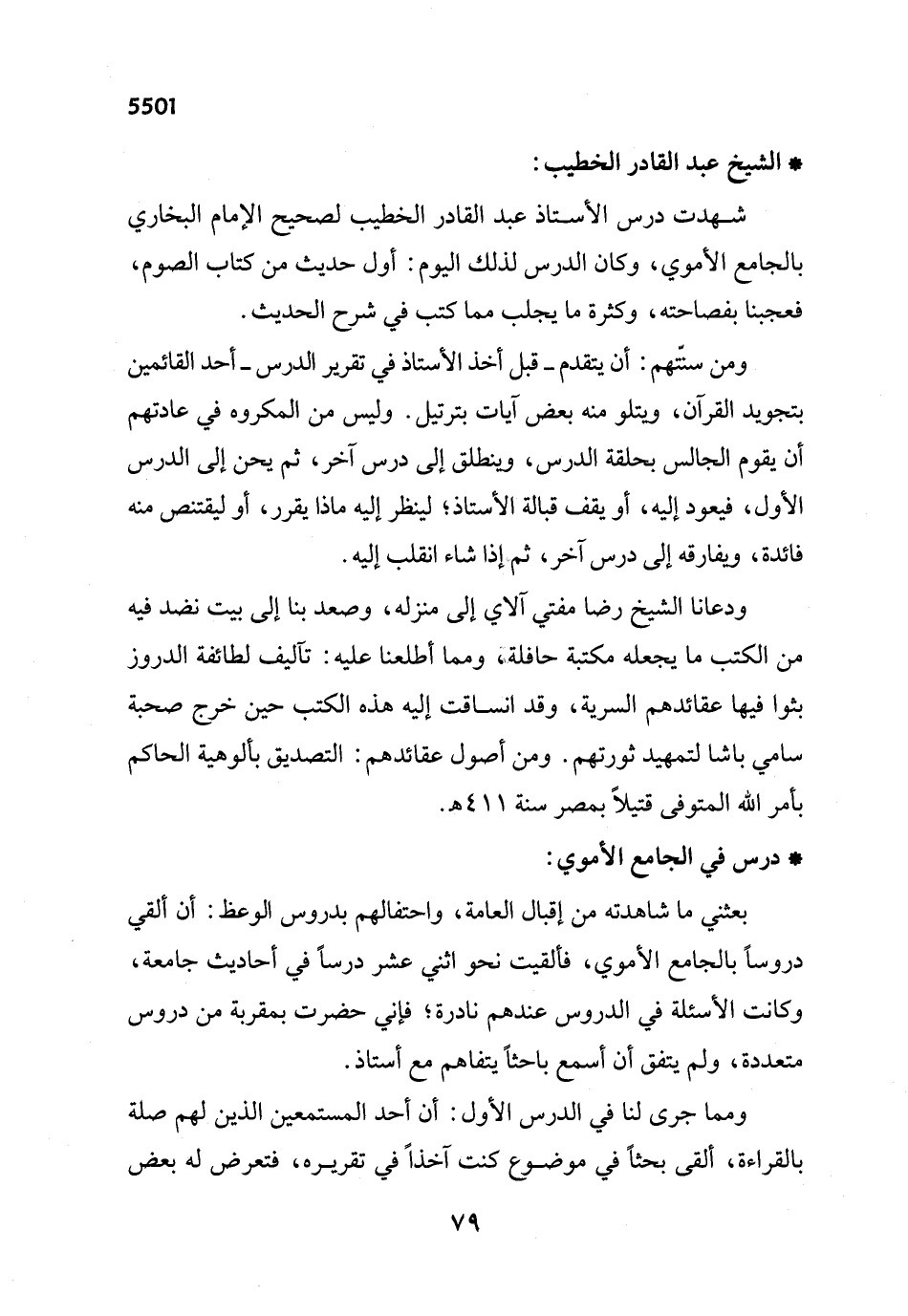شهدت درس الأستاذ عبد القادر الخطيب لصحيح الإمام البخاري بالجامع الأموي، وكان الدرس لذلك اليوم: أول حديث من كتاب الصوم، فعجبنا بفصاحته، وكثرة ما يجلب مما كتب في شرح الحديث.