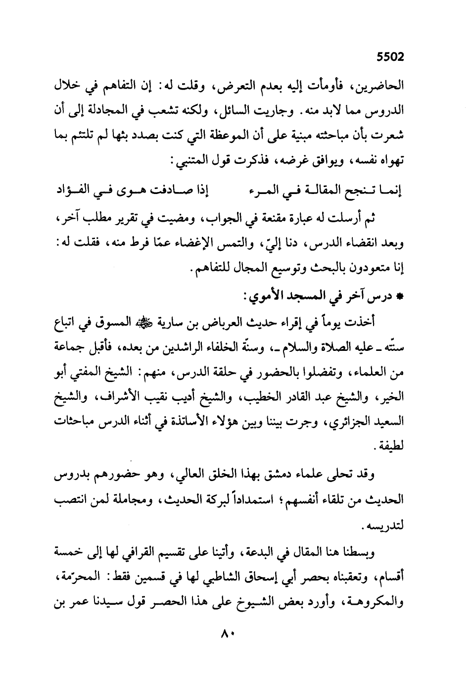أخذت يوماً في إقراء حديث العرباض بن سارية - رضي الله عنه - المسوق في اتباع سنّته - عليه الصلاة والسلام -، وسنّة الخلفاء الراشدين من بعده، فأقبل جماعة من العلماء، وتفضلوا بالحضور في حلقة الدرس، منهم: الشيخ المفتي أبو الخير، والشيخ عبد القادر الخطيب، والشيخ أديب نقيب الأشراف، والشيخ السعيد الجزائري، وجرت بيننا وبين هؤلاء الأساتذة في أثناء الدرس مباحثات لطيفة.