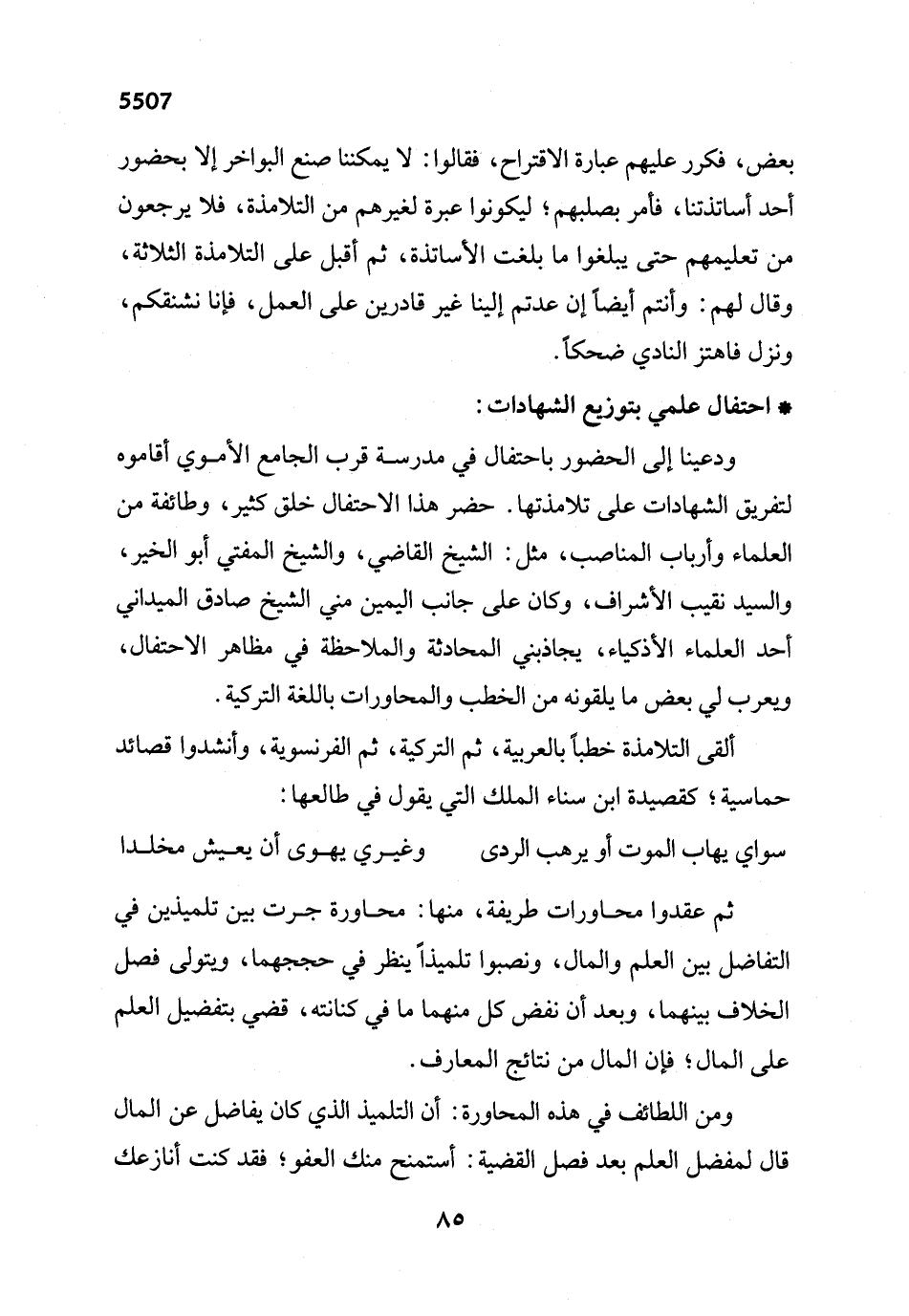 ودعينا إلى الحضور باحتفال في مدرسة قرب الجامع الأموي أقاموه لتفريق الشهادات على تلامذتها. حضر هذا الاحتفال خلق كثير، وطائفة من العلماء وأرباب المناصب، مثل: الشيخ القاضي، والشيخ المفتي أبو الخير، والسيد نقيب الأشراف، وكان على جانب اليمين مني الشيخ صادق الميداني أحد العلماء الأذكياء، يجاذبني المحادثة والملاحظة في مظاهر الاحتفال، ويعرب لي بعض ما يلقونه من الخطب والمحاورات باللغة التركية.
