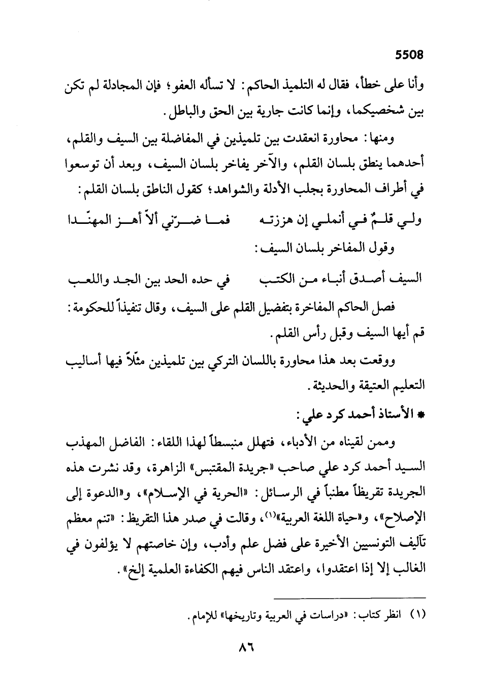 وممن لقيناه من الأدباء، فتهلل منبسطاً لهذا اللقاء: الفاضل المهذب السيد أحمد كرد علي صاحب "جريدة المقتبس" الزاهرة، وقد نشرت هذه الجريدة تقريظاً مطنباً في الرسائل: "الحرية في الإسلام"، و "الدعوة إلى الإصلاح" و"حياة اللغة العربية" (¬1)، وقالت في صدر هذا التقريظ: "تنم معظم تآليف التونسيين الأخيرة على فضل علم وأدب، وإن خاصتهم لا يؤلفون في الغالب إلا إذا اعتقدوا، واعتقد الناس فيهم الكفاءة العلمية إلخ".