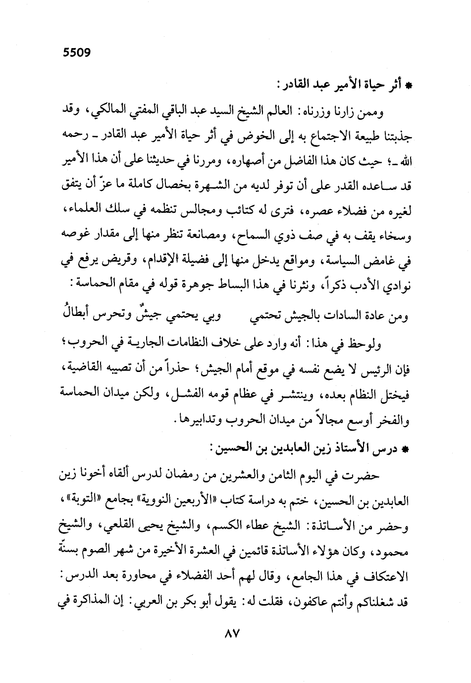 وممن زارنا وزرناه: العالم الشيخ السيد عبد الباقي المفتي المالكي، وقد جذبتنا طبيعة الاجتماع به إلى الخوض في أثر حياة الأمير عبد القادر -رحمه الله-؛ حيث كان هذا الفاضل من أصهاره، ومررنا في حديثنا على أن هذا الأمير قد ساعده القدر على أن توفر لديه من الشهرة بخصال كاملة ما عزّ أن يتفق لغيره من فضلاء عصره، فترى له كتائب ومجالس تنظمه في سلك العلماء، وسخاء يقف به في صف ذوي السماح، ومصانعة تنظر منها إلى مقدار غوصه في غامض السياسة، ومواقع يدخل منها إلى فضيلة الإقدام، وقريض يرفع في نوادي الأدب ذكراً، ونثرنا في هذا البساط جوهرة قوله في مقام الحماسة: