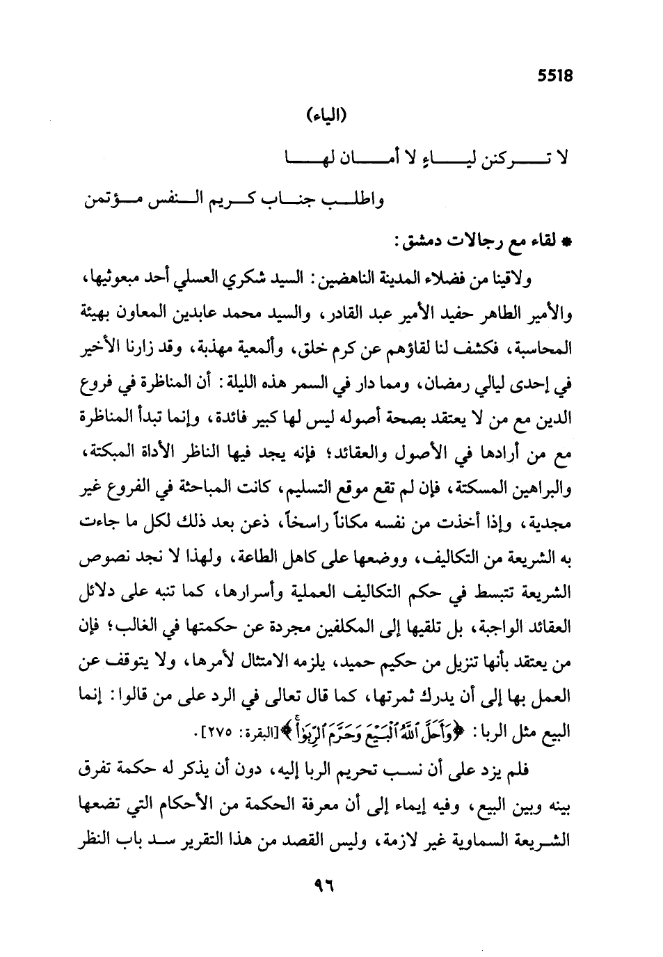 ولاقينا من فضلاء المدينة الناهضين: السيد شكري العسلي أحد مبعوثيها، والأمير الطاهر حفيد الأمير عبد القادر، والسيد محمد عابدين المعاون بهيئة المحاسبة، فكشف لنا لقاؤهم عن كرم خلق، وألمعية مهذبة، وقد زارنا الأخير في إحدى ليالي رمضان، ومما دار في السمر هذه الليلة: أن المناظرة في فروع الدين مع من لا يعتقد بصحة أصوله ليس لها كبير فائدة، وإنما تبدأ المناظرة مع من أرادها في الأصول والعقائد؛ فإنه يجد فيها الناظر الأداة المبكتة، والبراهين المسكتة، فإن لم تقع موقع التسليم، كانت المباحثة في الفروع غير مجدية، وإذا أخذت من نفسه مكاناً راسخاً، ذعن بعد ذلك لكل ما جاءت به الشريعة من التكاليف، ووضعها على كاهل الطاعة، ولهذا لا نجد نصوص الشريعة تتبسط في حكم التكاليف العملية وأسرارها، كما تنبه على دلائل العقائد الواجبة، بل تلقيها إلى المكلفين مجردة عن حكمتها في الغالب؛ فإن من يعتقد بأنها تنزيل من حكيم حميد، يلزمه الامتثال لأمرها، ولا يتوقف عن العمل بها إلى أن يدرك ثمرتها، كما قال تعالى في الرد على من قالوا: إنما البيع مثل الربا: {وَأَحَلَّ اللَّهُ الْبَيْعَ وَحَرَّمَ الرِّبَا} [البقرة: 275].