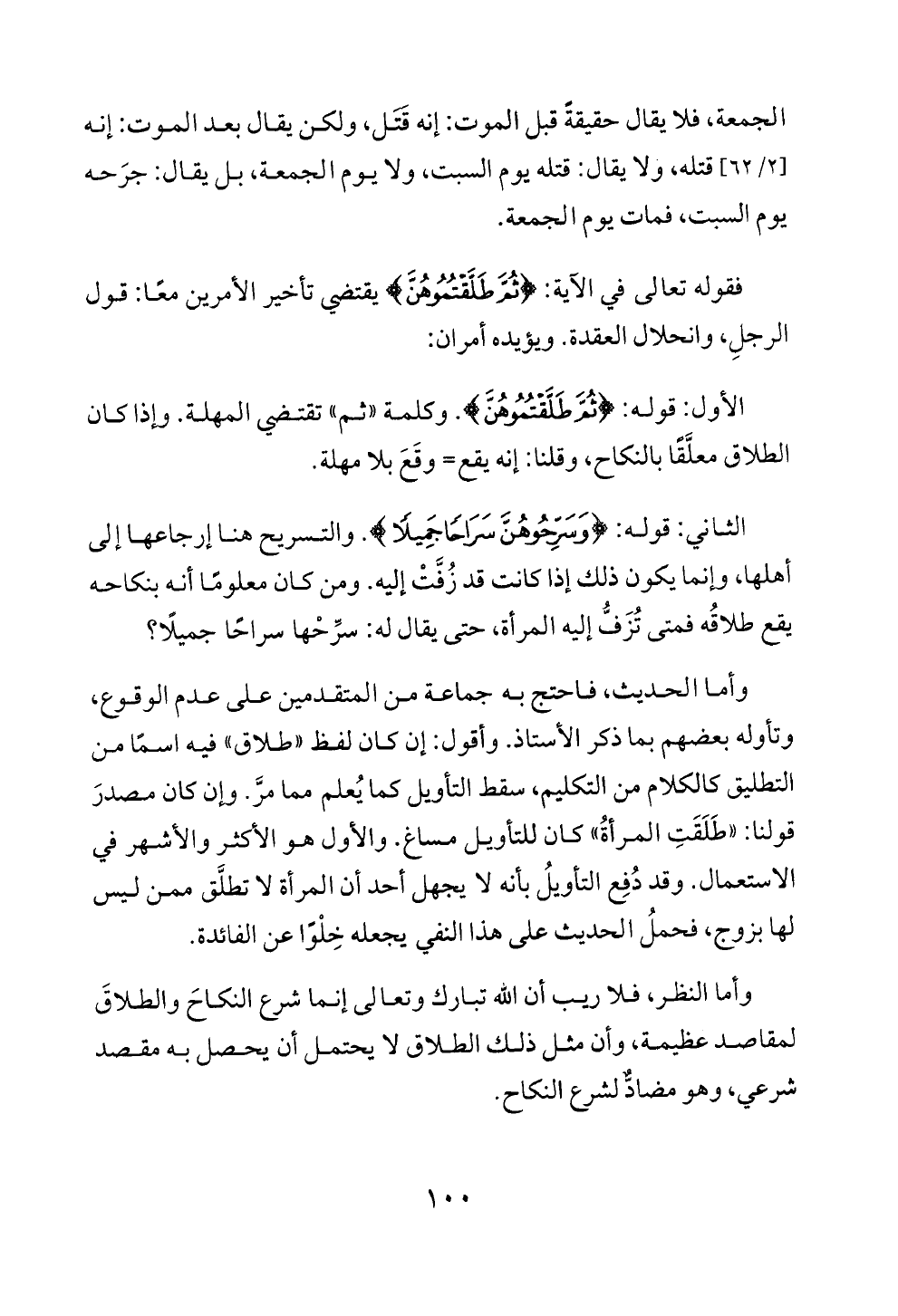 الثاني: قوله: {وَسَرِّحُوهُنَّ سَرَاحًا جَمِيلًا}. والتسريح هنا إرجاعها إلى أهلها، وإنما يكون ذلك إذا كانت قد زُفَّتْ إليه. ومن كان معلومًا أنه بنكاحه يقع طلاقُه فمتى تُزَفُّ إليه المرأة، حتى يقال له: سرِّحْها سراحًا جميلًا؟