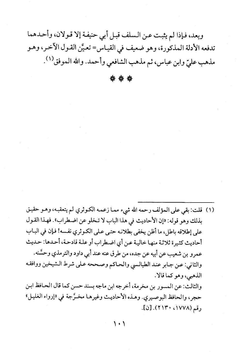 (¬١) قلت: بقي على المؤلف رحمه الله شيء مما زعمه الكوثري لم يتعقبه، وهو حقيق بذلك وهو قوله: "إن الأحاديث في هذا الباب لا تخلو عن اضطراب". فهذا القول على إطلاقه باطل، ما أظن يخفى بطلانه حتى على الكوثري نفسه! فإن في الباب أحاديث كثيرة ثلاثة منها خالية عن أي اضطراب أو علة قادحة، أحدها: حديث عمرو بن شعيب عن أبيه عن جده، من طرق عنه عند أبي داود والترمذي وحسَّنه.