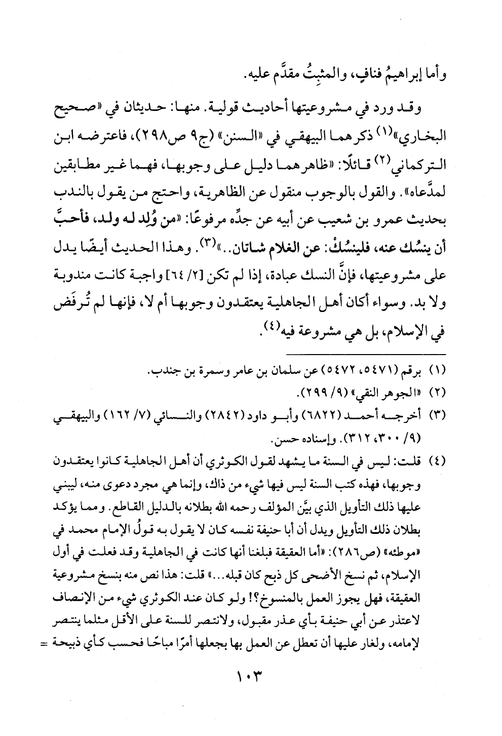 (¬٤) قلت: ليس في السنة ما يشهد لقول الكوثري أن أهل الجاهلية كانوا يعتقدون وجوبها، فهذه كتب السنة ليس فيها شيء من ذاك، وإنما هي مجرد دعوى منه، ليبني عليها ذلك التأويل الذي بيَّن المؤلف رحمه الله بطلانه بالدليل القاطع. ومما يؤكد بطلان ذلك التأويل ويدل أن أبا حنيفة نفسه كان لا يقول به قولُ الإمام محمد في «موطئه» (ص ٢٨٦): «أما العقيقة فبلغنا أنها كانت في الجاهلية وقد فعلت في أول الإسلام، ثم نسخ الأضحى كل ذبح كان قبله ... » قلت: هذا نص منه بنسخ مشروعية العقيقة، فهل يجوز العمل بالمنسوخ؟ ! ولو كان عند الكوثري شيء من الإنصاف لاعتذر عن أبي حنيفة بأي عذر مقبول، ولانتصر للسنة على الأقل مثلما ينتصر لإمامه، ولغار عليها أن تعطل عن العمل بها بجعلها أمرًا مباحًا فحسب كأي ذبيحة يذبحها الإنسان ليأكل من لحمها في غير مناسبة مشروعة! لو كان الكوثري منصفًا لقال كما قال العلامة أبو الحسنات اللكنوي ــ وهو حنفي مثله، ولكن شتان ما بينهما! ــ قال في تعليقه على كلمة الإمام محمد المتقدمة: «وإن أُريد أنها كانت في الجاهلية مستحبة أو مشروعة فلما جاء الإسلام رفض استحبابها وشرعيتها، فهو غير مسلم، فهذه كتب الحديث المعتبرة مملوءة من أحاديث شرعية العقيقة واستحبابها ... ».