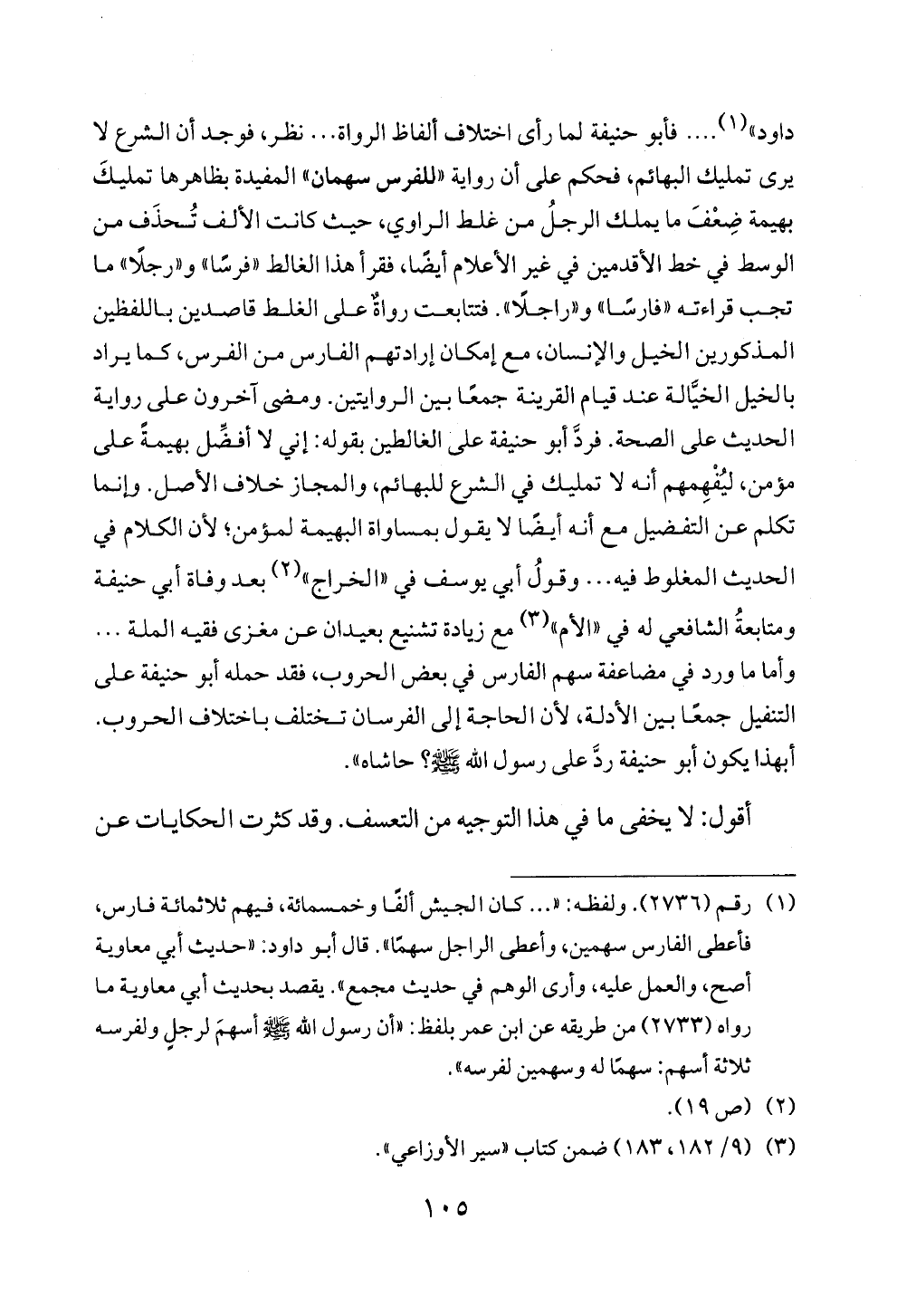 داود» (¬١) .... فأبو حنيفة لما رأى اختلاف ألفاظ الرواة ... نظر، فوجد أن الشرع لا يرى تمليك البهائم، فحكم على أن رواية «للفرس سهمان» المفيدة بظاهرها تمليكَ بهيمة ضِعْفَ ما يملك الرجلُ من غلط الراوي، حيث كانت الألف تُحذَف من الوسط في خط الأقدمين في غير الأعلام أيضًا، فقرأ هذا الغالط «فرسًا» و «رجلًا» ما تجب قراءته «فارسًا» و «راجلًا». فتتابعت رواةٌ على الغلط قاصدين باللفظين المذكورين الخيل والإنسان، مع إمكان إرادتهم الفارس من الفرس، كما يراد بالخيل الخيَّالة عند قيام القرينة جمعًا بين الروايتين. ومضى آخرون على رواية الحديث على الصحة. فردَّ أبو حنيفة على الغالطين بقوله: إني لا أفضِّل بهيمةً على مؤمن، ليُفْهِمهم أنه لا تمليك في الشرع للبهائم، والمجاز خلاف الأصل. وإنما تكلم عن التفضيل مع أنه أيضًا لا يقول بمساواة البهيمة لمؤمن؛ لأن الكلام في الحديث المغلوط فيه ... وقولُ أبي يوسف في «الخراج» (¬٢) بعد وفاة أبي حنيفة ومتابعةُ الشافعي له في «الأم» (¬٣) مع زيادة تشنيع بعيدان عن مغزى فقيه الملة ... وأما ما ورد في مضاعفة سهم الفارس في بعض الحروب، فقد حمله أبو حنيفة على التنفيل جمعًا بين الأدلة، لأن الحاجة إلى الفرسان تختلف باختلاف الحروب. أبهذا يكون أبو حنيفة ردَّ على رسول الله - صلى الله عليه وسلم - ؟ حاشاه».